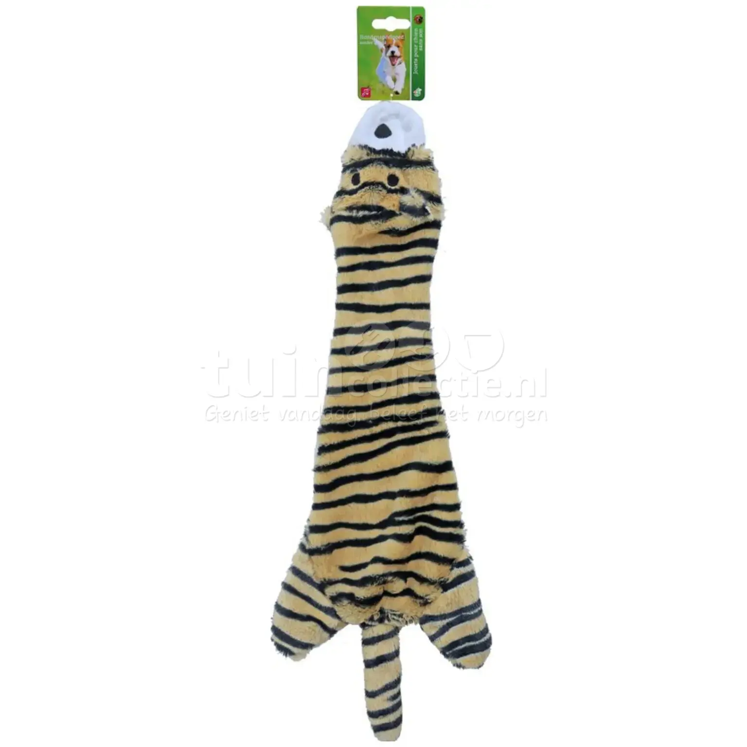 Geef je huisdier het perfecte knuffelmaatje! Deze tijger is gemaakt van zacht pluche. Door zijn lengte van 55cm is deze platte knuffel geschikt voor grotere honden. Het speeltje bevat 2 piepers en maakt hierdoor een piepgeluid wanneer erop geknepen of gebeten wordt. Bovendien heeft het speelgoed geen losse onderdelen aan de buitenzijde, waardoor het extra veilig is voor jouw trouwe viervoeter. Deze pluche tijger is perfect om mee te knuffelen en te spelen, maar let op: het is geen kauwspeeltje!