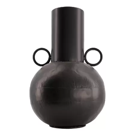 Geef een stoere touch aan jouw interieur met deze bijzondere vaas. De vaas is geheel zwart van kleur en gemaakt van metaal, dat op een ruw manier is afgewerkt. De onderzijde bestaat uit een bol met een diameter van 26cm met daar bovenop een koker. De totale hoogte van deze vaas is ca. 41cm. Daarnaast is hij perfect te combineren met kunsttakken, kunst- en droogbloemen of pampas pluimen. Wil je liever echte bloemen in de vaas zetten? Gebruik dan een binnenhoes of vaasje, aangezien hij door het metaal niet waterdicht is.