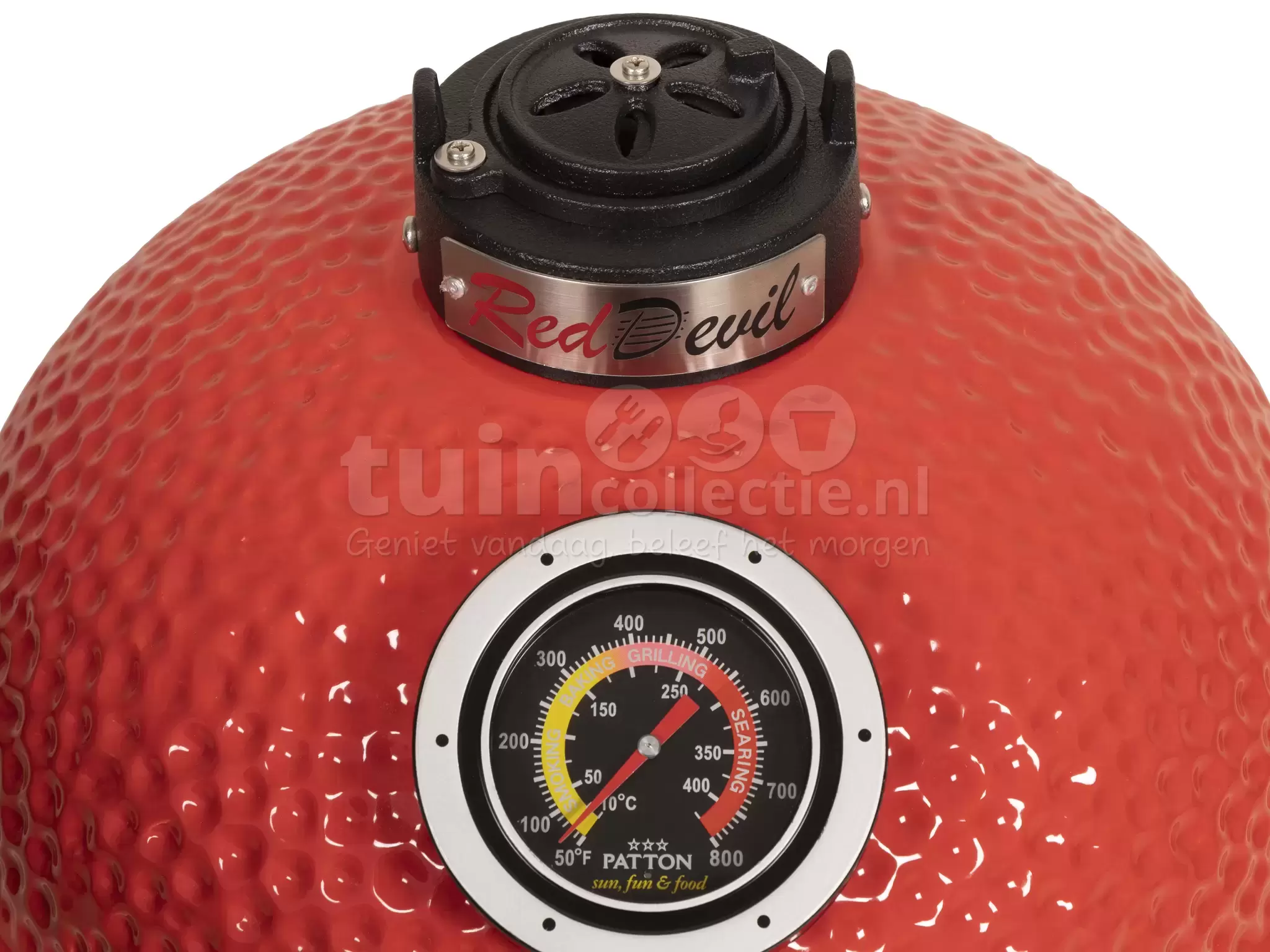 Deze speciale 'Red Devil' edition is uitgevoerd in opvallend rood met een zwart onderstel en mag zeker gezien worden in de tuin! De 15 inch Red Devil heeft een totale hoogte van 60cm en een diameter van 53cm. Het grilloppervlak heeft een diameter van 34cm en is zo ontworpen dat het is uitgerust met een scharnierend deel, waardoor je tijdens het grillen op eenvoudige wijze houtskool kunt toevoegen zonder het volledige grillrooster te hoeven optillen. Verder is hij voorzien van een ventilatierooster aan de onderzijde en een margrietschijf/top vent en een luxe XL thermometer, inclusief kalibratiefunctie, op het deksel. Hiermee creëer je een gecontroleerde luchtstroom en ben je verzekerd van de juiste temperatuur voor jouw gerecht.