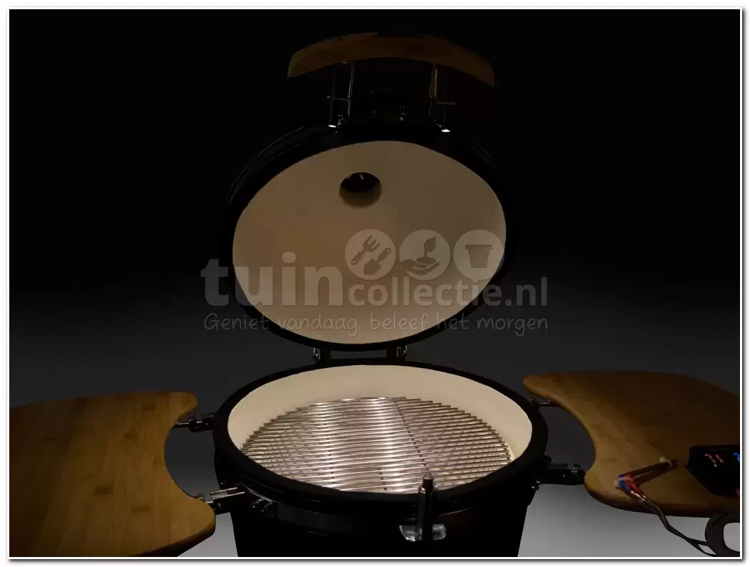 Een andere luxe toevoeging aan deze Kamado is dat hij uitgerust is met de Bluetooth VI Smart kerntemperatuur meter met high-end full colour LED display, waarbij je op afstand tot maar liefst zes gerechten kunt monitoren op je IOS of Android device (telefoon en/of tablet). Daarnaast beschikt deze Kamado over tweevoudige LED verlichting geïntegreerd in het handvat, zodat je ook tijdens schemer/donker jouw gerecht nog altijd ziet, en “last but not least” de nieuwe forse XL deksel thermometer welke er voor zorgt dat je de temperatuur in de Kamado altijd helder en duidelijk kunt aflezen. Daarnaast is deze Patton thermometer tevens te kalibreren zodat je altijd kunt vertrouwen op de juiste temperatuur weergave
