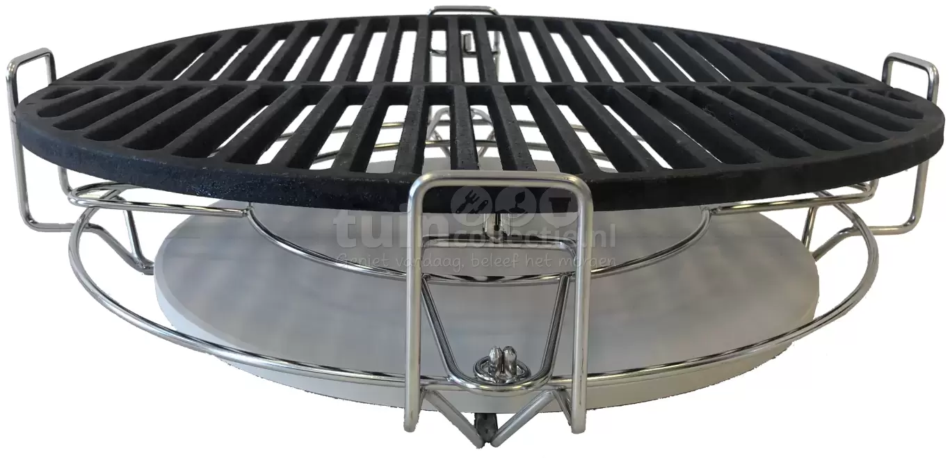 Leg dit Kamado multi cooking system in je barbecue en kies op welke manier je wilt barbecueën. Met de halve maan heat deflector platen verhit je indirect het vlees. Verder kun je ook een wokpan installeren op het middenframe van deze Kamado accessoire. Het multi cooking system bestaat uit twee halve gietijzeren rooster elementen, twee halve keramische heat deflector platen en een middenring (voor een wokpan). Deze bbq uitbreidingsset is geschikt voor een 21 inch Kamado barbecue en heeft een diameter van 48cm. Geen twijfel meer met de verschillende manieren om te barbecueën met dit multi cooking system!