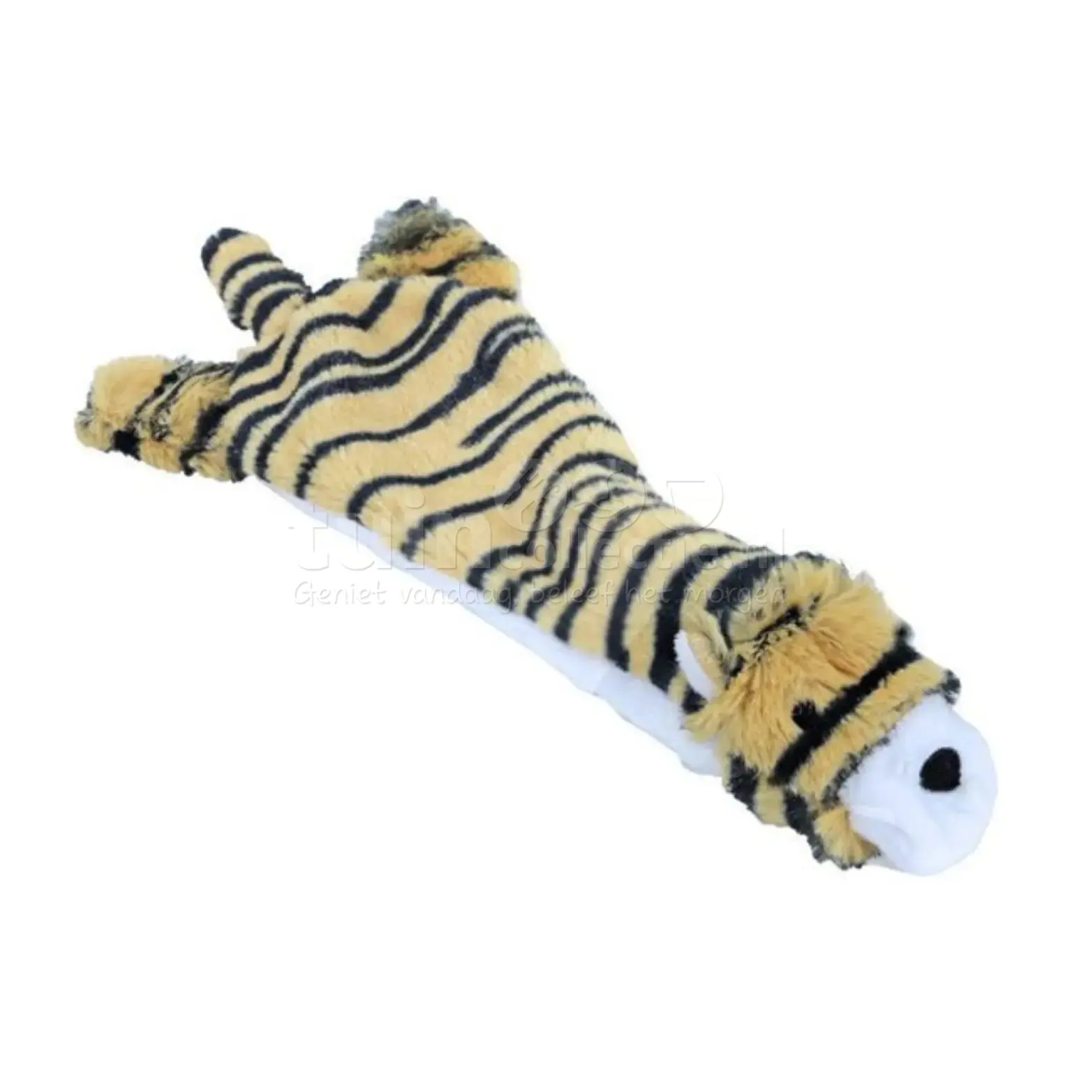 Geef je huisdier het perfecte knuffelmaatje! De tijger is gemaakt van zacht pluche en is ideaal voor je huisdier tijdens het slapen of spelen. Met een lengte van 35cm is deze platte knuffel geschikt voor kleinere honden. Het speeltje bevat 2 piepers en maakt daardoor een piepgeluid wanneer erop geknepen of gebeten wordt, dit stimuleert het speelinstinct van je hond. Het speelgoed heeft geen losse onderdelen aan de buitenzijde en is daardoor extra veilig voor jouw trouwe viervoeter. Deze pluche tijger is perfect om mee te knuffelen en te spelen, maar let op: het is geen kauwspeeltje!