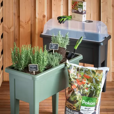 Kweek je eigen groente- en kruidenplantjes in Kweektafel Venezia. Deze kweektafel van het merk Artevasi is van alle gemakken voorzien, zodat je comfortabel op hoogte kunt tuinieren. De vier poten kunnen afgedekt worden met de geperforeerde afdekdoppen en dienen als drainagesysteem voor het overtollige water. Mocht je de kweektafel binnen plaatsen, dan zijn de poten aan de onderzijde af te dekken met een dop, zo blijft het water in de poten staan. Daarnaast worden er twee metalen stabilisators voor in de kweekbak meegeleverd. De Venezia Kweektafel is gemaakt van hoogwaardig kunststof (PE) en is mat antraciet van kleur. De kweekbak heeft een lengte van 80cm een breedte van 39cm en een hoogte van 69cm. De binnenmaat is 73x32x28cm en de inhoud van de bak is 58 liter.