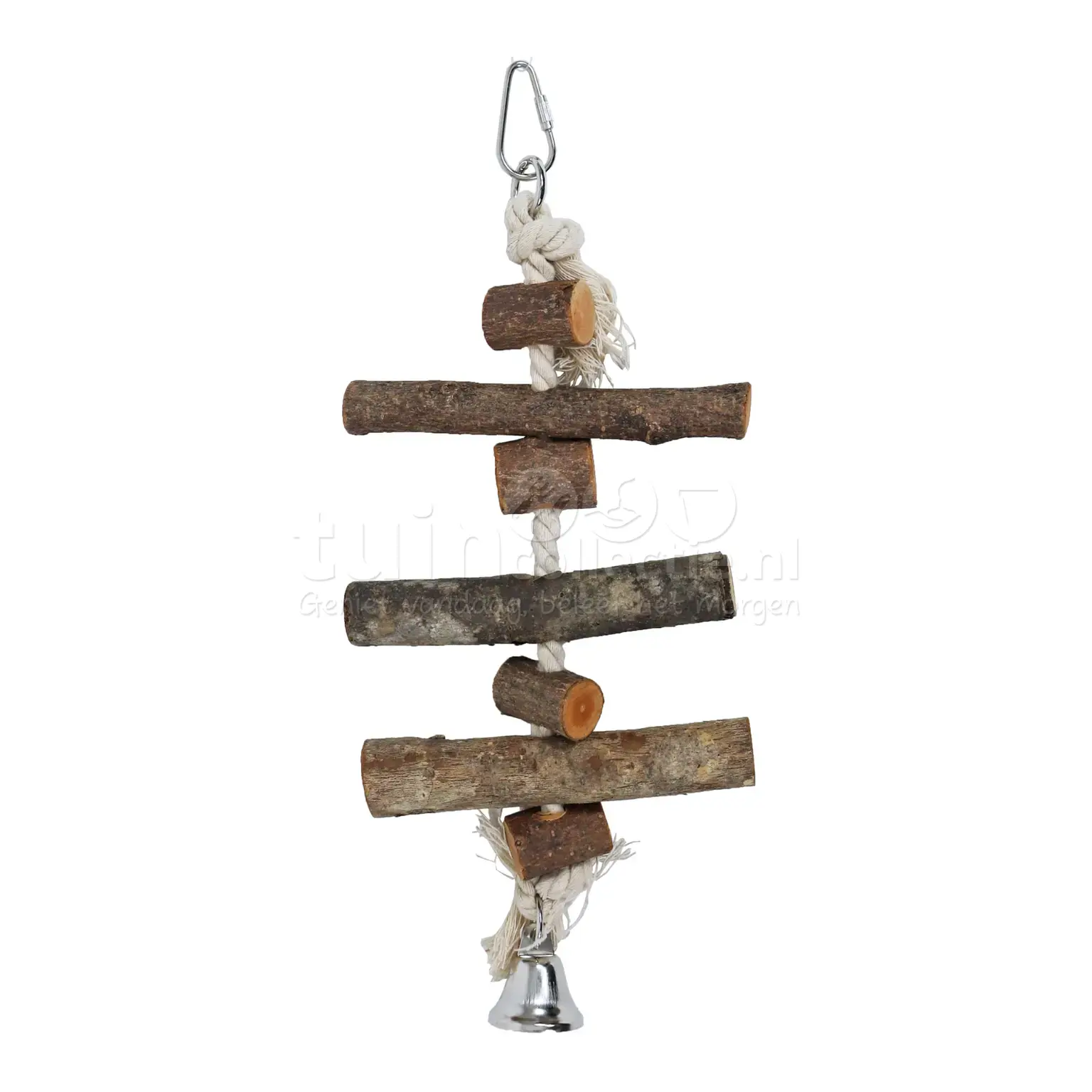 Geef je vogel speelplezier met de Trapezeboom van Boon! Dit speeltje bestaat uit een stevig katoenen touw waaraan 7 houten stokjes zijn bevestigd in verschillende lengtes. Daarnaast is hij ook voorzien van een bel die geluid maakt wanneer je vogel ermee speelt. Dit maakt het speeltje nog aantrekkelijker voor je vogel. Verder heeft het vogelspeelgoed een lengte van 33cm. Middels de handige haak kun je het speeltje eenvoudig aan de kooi of volière bevestigen. Dit speelgoed houdt je vogel actief en voorkomt verveling.