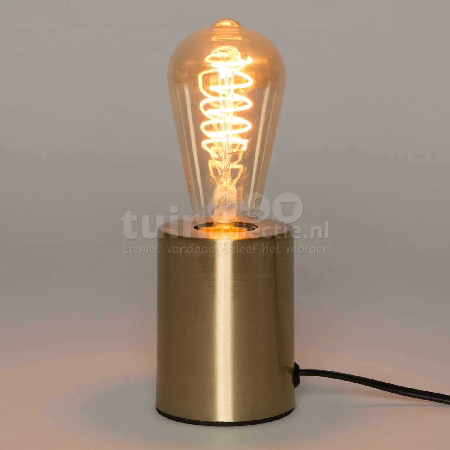 Deze gouden tafellamp staat prachtig naast de tv, op het dressoir, in de open kast of op het nachtkastje! Hij is gemaakt van metaal en is voorzien van de standaard E27 fitting. Daarnaast is hij voorzien van een 1,5 meter lang zwart snoer met handige aan/uit knop. Kies een mooie lamp en draai hem in de fitting, steek de stekker in het stopcontact en je geniet snel van een mooie lamp in huis! De tafellamp heeft een hoogte van 10cm en een diameter van 7cm.