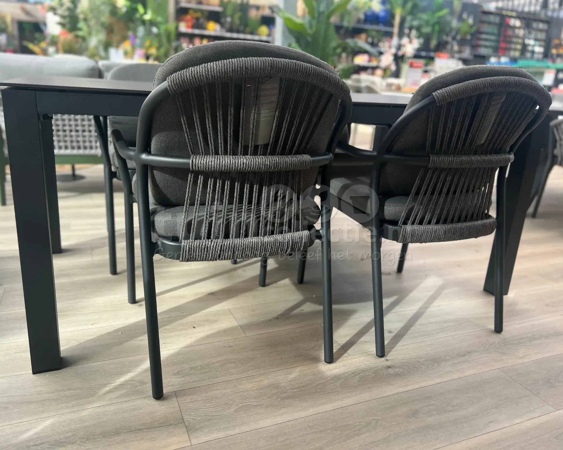 Een comfortabele én mooie tuinstoel voor aan de tuintafel mag niet ontbreken op jouw terras! Deze Fico dining tuinstoel van Tierra Outdoor heeft beide eigenschappen en is met vele soorten tuintafels te combineren. Daarbij heeft de stoel ook als voordeel dat hij stapelbaar is. Verder bestaat de stoel uit een afgerond aluminium frame in de kleur charcoal (houtskool grijs) en is bij de rugleuning bespannen met hoogwaardig olefin touw. Het touw geeft de stoel extra uitstraling en mag daardoor zeker gezien worden in jouw tuin. Ook is de tuinstoel voorzien van een zit- en rugkussen in de kleur charcoal dat voor een comfortabele zit zorgt. De zitting bestaat uit textileen. Kies jouw favoriete tuintafel en combineer hem met deze fijne Fico tuinstoel!