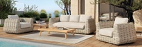 De Wakkanda loungeset is een bijzonder mooie en stoere tuinset! De twee grote stoelen en de drie-zitbank zorgen voor een heerlijk zitcomfort en passen perfect op een groot terras. Tevens is de set voorzien van een mooie teakhouten tafel. De stoelen en bank bestaan uit een stevig aluminium frame met daaromheen extra dik 12mm gevlochten wicker. Het XXL wicker heeft de zomerse kleur kubu (zand/beige). De extra dikke Swiss Fabric all weather kussens zijn ecru van kleur en zorgen voor een comfortabele zit, waardoor je de hele dag in de tuin kunt genieten. Creëer eenvoudig een luxe en mediterrane look op je terras met de Wakkanda Loungeset!
