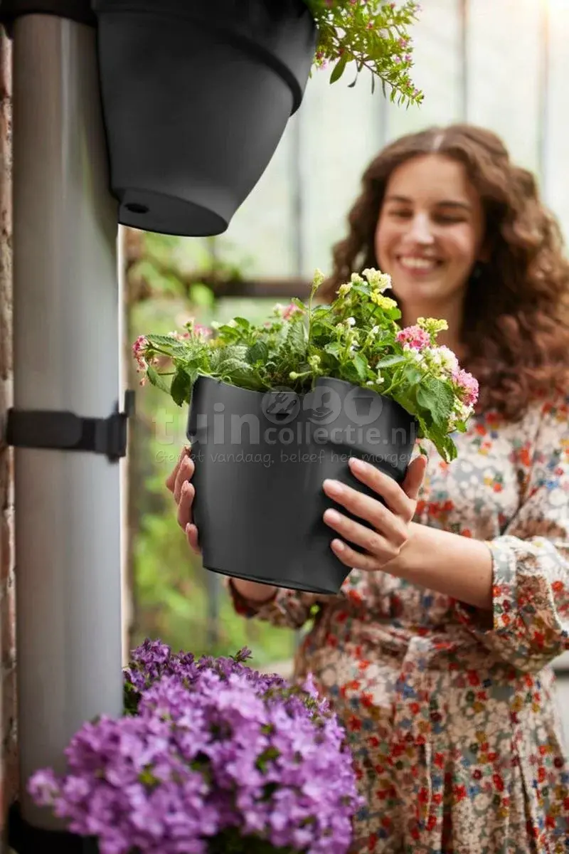 Op zoek naar nieuwe manieren om je te omringen met groen? Met deze regenpijp plantenbak tover je ook je regenpijp om in een groene oase! Het Vibia Campana regenpijpbakje van Elho bevestig je eenvoudig aan je regenpijp met de meegeleverde klitteband strap. Je wikkelt de klittenband om je regenpijp en trekt deze strak aan. Dankzij het anti-slip gedeelte welke je aan de achterzijde van de regenpijp bevestigd, glijdt de bloempot niet naar beneden. Het regenpijp plantenbakje kun je vervolgens eenvoudig aan het clipje hangen. De bloempot is gemaakt van 100% gerecycled plastic en de bodem van de pot heeft een overlooppijpje wat zorgt voor opslag van een kleine watervoorraad en waardoor overtollig water weg kan lopen. Zo blijven jouw planten in optimale conditie. Verder is de bloempot 16cm hoog en heeft hij een totale diameter van ca.22cm.