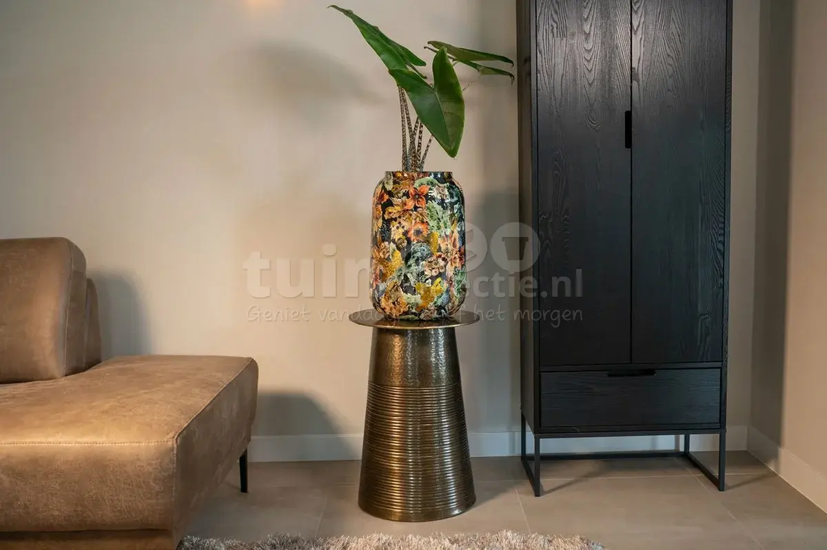 Laat jouw kamerplant of boeket bloemen stralen in deze Lammie Berry Blue bloempot van Ter Steege! Deze bloempot is afkomstig uit de collectie van kunstenares Lammie en kenmerkt zich door de print met bessen, bloemen en blad in verschillende blauwtinten, groen, warme aardekleuren en met een touch of gold. De bloempot bestaat uit één stuk metaal en een high-gloss epoxylaag, waardoor hij waterdicht is. Echter heeft metaal de eigenschap om te oxideren als het in contact komt met water. Maak daarom gebruik van een inzethoes of waterdichte plastic zak om roesten te voorkomen. Verder is hij 42cm hoog met een diameter van 30cm op het breedste punt. Daarnaast is de onderzijde voorzien van nopjes, waardoor de ondergrond niet zal beschadigen.