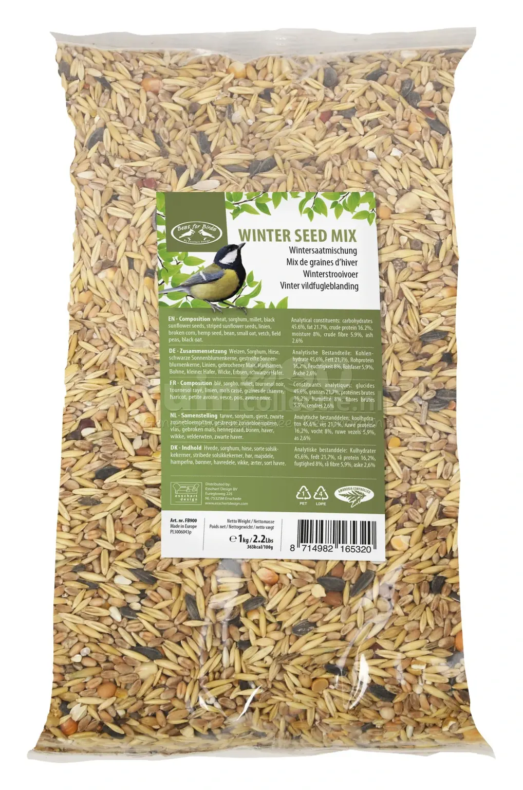 Geef de vogels in je tuin deze winter extra voeding met dit speciaal samengestelde wintervoer. Strooi het vogelvoer op de grond, op de voedertafel of vul de voedersilo ermee. De zadenmix bestaat uit tarwe, sorghum, gierst, zwarte zonnebloempitten, gestreepte zonnebloempitten, vlas, gebroken maïs, hennepzaad, bonen, haver, wikke, velderwten en zwarte haver. Zo krijgen de vogels gevarieerd voer, waarmee ze de wintermaanden goed doorkomen. Deze zak vogelvoer heeft een inhoud van 1 kg.