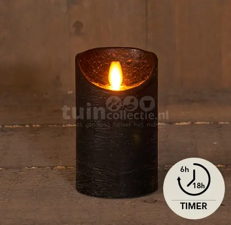 Geniet veilig van het sfeervolle flakkerende vlamlicht van deze zwarte LED kaars. Deze LED kaars is bijna niet van een echte kaars te onderscheiden, maar is zonder het risico op brand of druipend heet kaarsvet. De wax kaars is 7,5cm breed en 12,5cm hoog. Hij werkt op 3x AAA-batterijen (niet inbegrepen). Tevens heeft deze verlichting een timerfunctie, waarmee de verlichting 6 uur lang brandt en daarna automatisch voor 18 uur uit gaat. De lampjes gaan de volgende dag automatisch weer aan op het tijdstip waarop ze de eerste keer zijn ingeschakeld. Plaats meerdere LED kaarsen met een andere hoogte of kleur bij elkaar voor een sfeervol geheel.