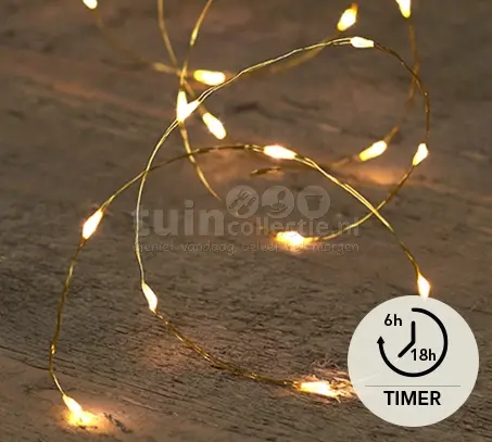 Met gouden draadverlichting geef je in een handomdraai sfeer aan kerstdecoratie in huis. Deze zeer dunne gouddraad is 1 meter lang en voorzien van 20 kleine LED lampjes met warm wit licht. De draad is makkelijk te buigen en is goud van kleur. De verlichting werkt op 2x AA-batterijen en is voorzien van een handige timerfunctie. Wanneer je kiest voor de timerfunctie, brandt de verlichting 6 uur lang en gaat daarna automatisch voor 18 uur uit. De verlichting gaat de volgende dag automatisch weer aan op het tijdstip waarop ze de eerste keer zijn ingeschakeld. De transparante batterijhouder zit middels een 10cm lang aanloopsnoer verbonden aan de gouddraad. Deze kerstverlichting is geschikt voor binnenshuis.