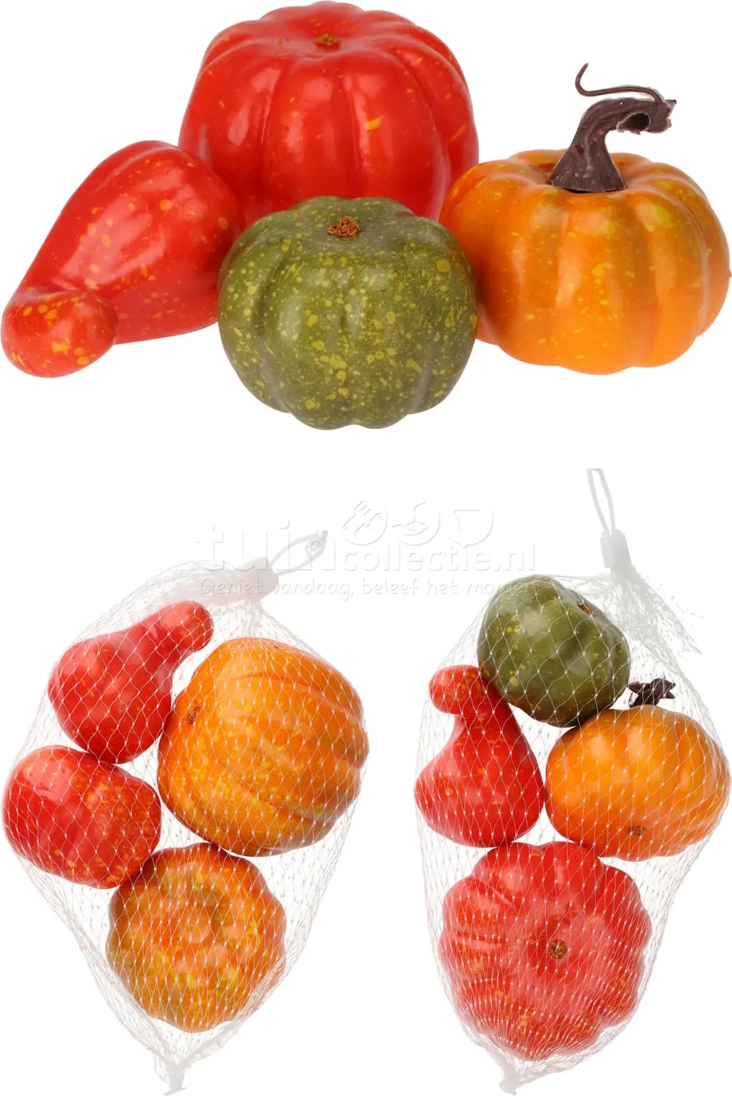 Leuke set met decoratie pompoenen. 4 stuks in een netje met leuke herfsttinten. Erg sfeervol om mee te decoreren in huis. Geef je dressoir, tafel of andere plek in huis dit najaar een nieuwe look met deze pompoen decoratie! De pompoenen zijn gemaakt van foam en hebben verschillende maten en kleuren. Er zijn 2 verschillende sets*.