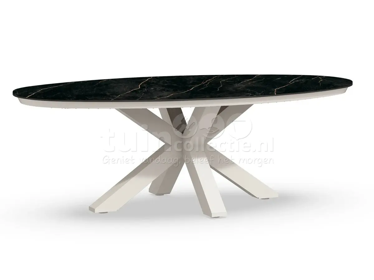 Gezellige avonden borrelen of dineren in de tuin kan het meest comfortabel aan een fijne tuintafel. Daarbij geeft een ovale tafel net een andere dynamiek dan een rechthoekige tafel en wordt het vaak als 'gezelliger' beschouwd. De marble look Oblong tuintafel van Tierra Outdoor is een bijzondere ovaalvormig eettafel voor buiten, waar je uren aan kunt doorbrengen. Deze Oblong tuintafel heeft een lengte van 220cm en een breedte van 130cm. Hierdoor biedt hij plek aan 6 tuinstoelen. Daarnaast bestaat deze eettafel uit een aluminium matrix tafelpoot in de kleur creme white en een trespa tafelblad met een grijs-zwarte marmerlook. Het trespa tafelblad is bestand tegen uv-straling, diverse weersomstandigheden en vervuiling. Combineer deze crème witte Oblong travertin tuintafel met diningstoelen naar keuze en geniet volop van het mooie weer.