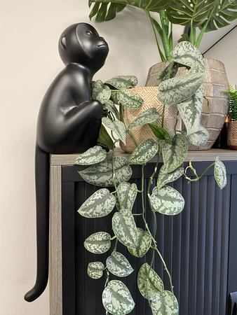 Maak een statement in huis met dit grote apen beeld. Het beeld, in de vorm van een aap, is extra bijzonder omdat hij zit en de lange staart recht naar beneden hangt. Hierdoor is hij dus uitermate geschikt om op een hoge kast te plaatsen. Daarnaast is het beeld voor binnen volledig zwart van kleur wat een moderne twist geeft. Verder is de aap in totaal 79cm lang en aan de onderzijde van het lijf voorzien van vilt. Hierdoor zal de ondergrond, zoals de kast, niet beschadigd raken.