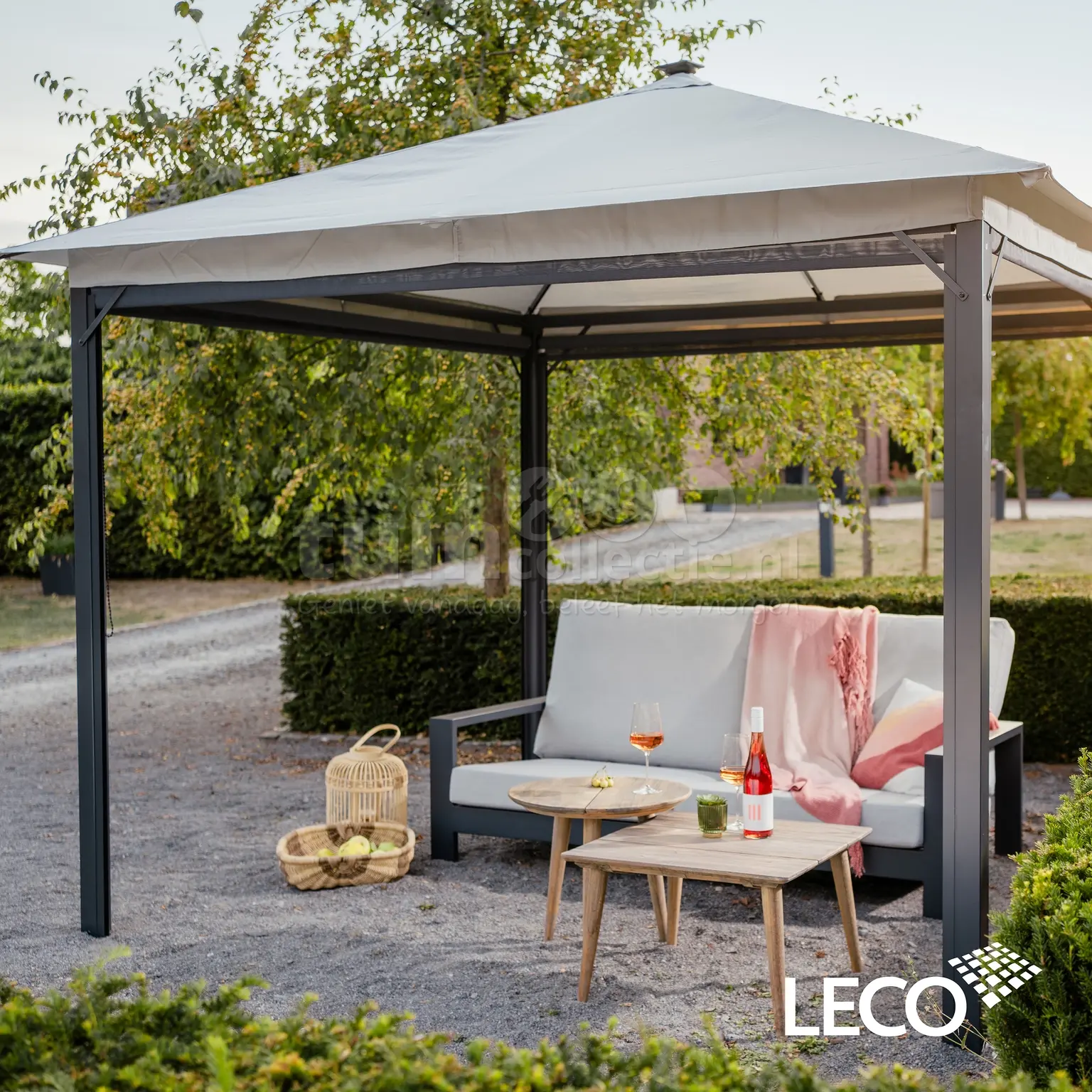 Met Leco paviljoen Lina geniet je de hele zomer heerlijk in de tuin! Dit paviljoen is vierkant van vorm met een afmeting van 300x300cm en een hoogte van 261cm. Hij bestaat uit een gepoedercoat aluminium en stalen frame in de kleur antraciet en een weerbestendig dakdoek van 100% polyester in de kleur lichtgrijs. Daarbij is paviljoen Lina aan alle 4 de zijden voorzien van een (seetrough) gaasrolgordijn dat eenvoudig met de hand via een kettingtakel te bedienen is. Je kiest eenvoudig zelf hoe ver je de rolgordijnen laat zakken. Deze gaasrolgordijnen zijn gemaakt van een weerbestendige textileen (kunststofvezel: 70% PVC en 30% polyester) en bieden bescherming tegen insecten en wind, zonder dat je het uitzicht verliest. Een ander groot voordeel van dit paviljoen is de LED verlichting die in het aluminium dakframe bevestigd zit en met een knop in het frame te bedienen is. Hierdoor geniet je in de avonduren van gezellig sfeerlicht onder het paviljoen. Deze LED verlichting heeft 2 helderheidsniveaus (helft van de verlichting aan of alle verlichting aan) en kan op 2 manieren opgeladen worden; via zonne-energie en via een oplaadkabel op netstroom. Bij een volledig opgeladen batterij brandt de verlichting maximaal 4 uur. Paviljoen Lina zorgt met zijn moderne design en talloze voordelen voor op en top genot in de tuin.