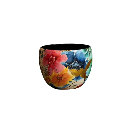Laat ook jouw kleinste kamerplantje stralen in deze Lammie Sparkle Spring bloempot van Ter Steege! Dit kleine bloempotje is afkomstig uit de collectie van kunstenares Lammie en kenmerkt zich door het bloemenpatroon in zachtroze, blauw en groen met een touch of gold. De bloempot bestaat uit één stuk metaal en een high-gloss epoxylaag, waardoor hij waterdicht is. Echter heeft metaal de eigenschap om te oxideren als het in contact komt met water. Maak daarom gebruik van een inzethoes of waterdichte plastic zak om roesten te voorkomen. Verder is hij 7cm hoog met een diameter van 9cm op het breedste punt. Daarnaast is de onderzijde voorzien van nopjes, waardoor de ondergrond niet zal beschadigen.
