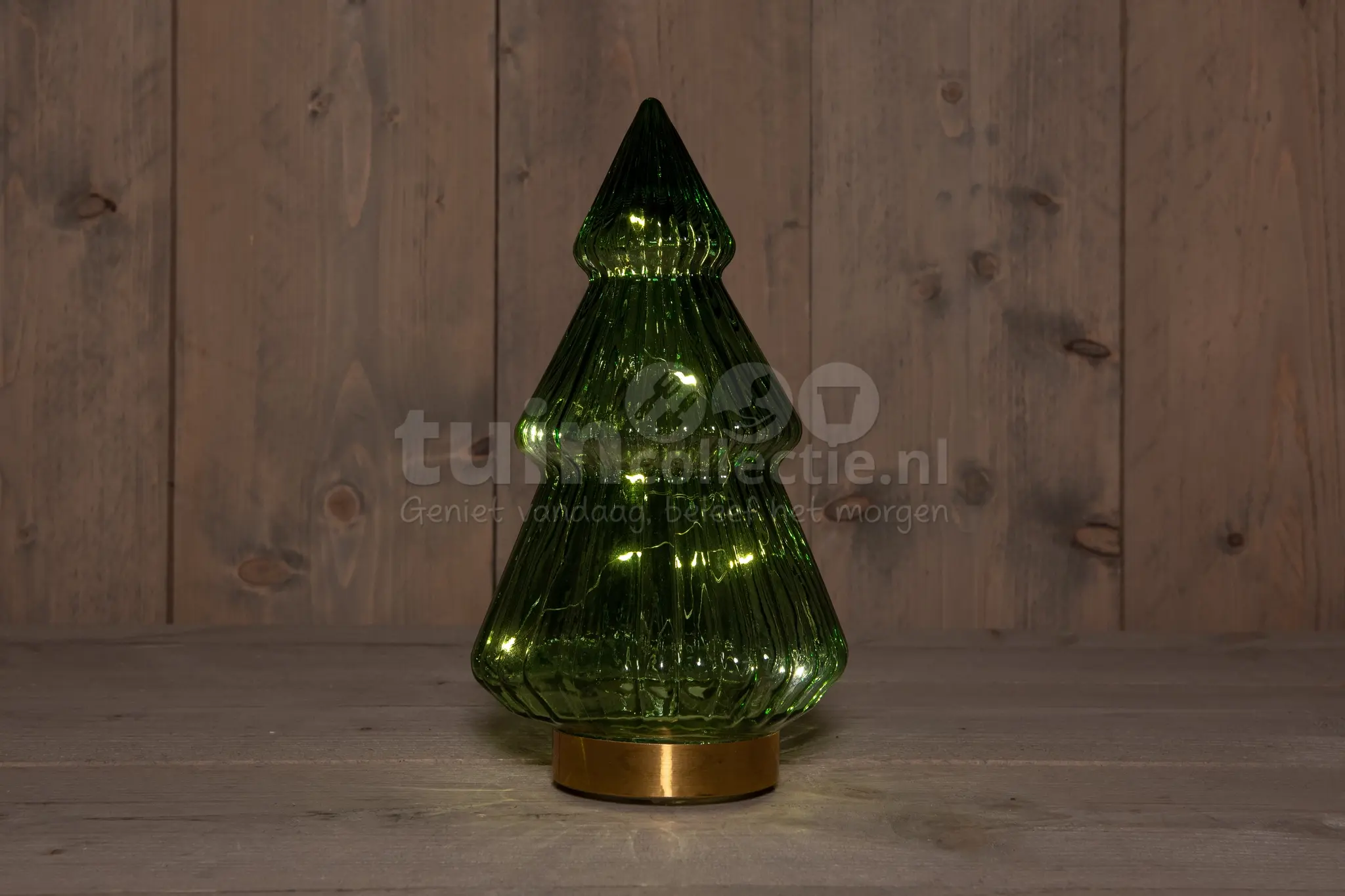 Deze tafellamp, in de vorm van een kerstboom, is ideaal als sfeerlicht naast de tv, op het dressoir of gedecoreerd op tafel tijdens de kerstperiode. Hij is voorzien van draadverlichting met kleine LED lampjes met warm wit licht. Verder is de sfeerlamp gemaakt van glas met een rib structuur en is groen van kleur. De voet is goud van kleur en aan de onderzijde voorzien van de batterijhouder met de aan/uit knop en timerfunctie. De LED verlichting werkt op 3 AA-batterijen. Wanneer je kiest voor de timerfunctie brandt de verlichting 6 uur lang en gaat daarna voor 18 uur uit. De verlichting gaat de volgende dag automatisch weer aan op het tijdstip waarop ze de eerste keer zijn ingeschakeld. Doordat deze tafellamp op batterijen werkt is hij gemakkelijk overal in huis te plaatsen. Het kerstboompje met verlichting is 29cm hoog en heeft en een diameter van 15cm.
