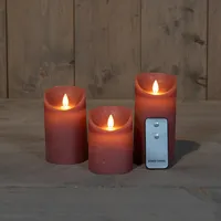Geniet van veilig en sfeervol flakkerend vlamlicht met deze LED kaarsen op batterijen. De set LED kaarsen zijn gemaakt van kunststof en echte wax, waardoor ze bijna niet van echt te onderscheiden zijn. Hierdoor is er geen kans op heet, druipend kaarsvet en is er geen brandgevaar. De set bestaat uit 3 antiek roze kaarsen van 10, 12,5 en 15cm hoog. Alle drie hebben ze een diameter van 7,5cm. Elke kaars werkt op 3x AAA-batterijen. Daarnaast is deze set voorzien van een afstandsbediening, waarmee je de kaarsen heel eenvoudig van een afstandje aan en uit kunt zetten.