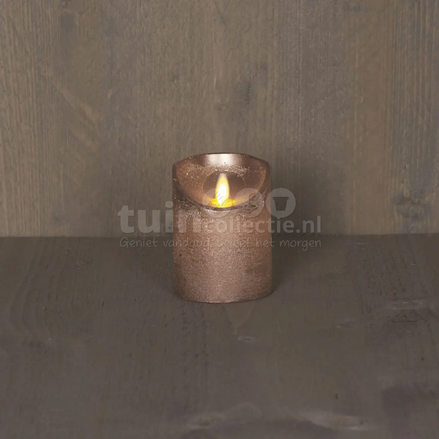Geniet veilig van het sfeervolle flakkerende vlamlicht van deze LED kaars in de kleur brons. Deze LED kaars is bijna niet van een echte kaars te onderscheiden, maar is zonder het risico op brand of druipend heet kaarsvet. De wax kaars is 7,5cm breed en 10cm hoog. Hij werkt op 3x AAA-batterijen (niet inbegrepen). Tevens heeft deze verlichting een timerfunctie, waarmee de verlichting 6 uur lang brandt en daarna automatisch voor 18 uur uit gaat. De lampjes gaan de volgende dag automatisch weer aan op het tijdstip waarop ze de eerste keer zijn ingeschakeld. Plaats meerdere LED kaarsen met een andere hoogte of kleur bij elkaar voor een sfeervol geheel.