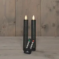 Met deze LED dinerkaarsen op batterij geniet je jaarrond van sfeervol en veilig kaarslicht in huis. De set bestaat uit 2 antracieten wax kaarsen met LED verlichting en zijn voorzien van een bewegend vlammetje. De antraciet kleur is voorzien van een metallic glitter look, waardoor hij extra schittert. Beide kaarsen hebben een hoogte van 18cm en zijn daarmee korter dan de standaard dinerkaars. Ze werken met de bijgeleverde afstandsbediening met diverse handige functies; aan of uit knop, keuze uit kaarslicht of gewoon licht, keuze uit 4 verschillende brandtijden met de timerfunctie en instelbare lichtsterkte met de dimfunctie. Je kunt de kaarsen dus helemaal naar wens en sfeer instellen! De LED dinerkaarsen werken elk op 1 AA-batterij. De afstandsbediening is reeds voorzien van een knoopcelbatterij.