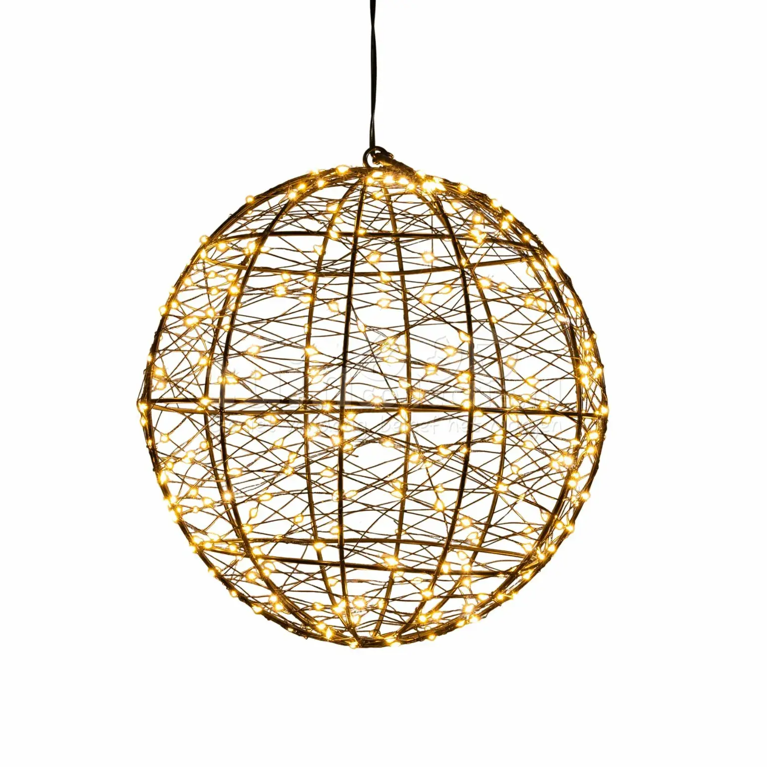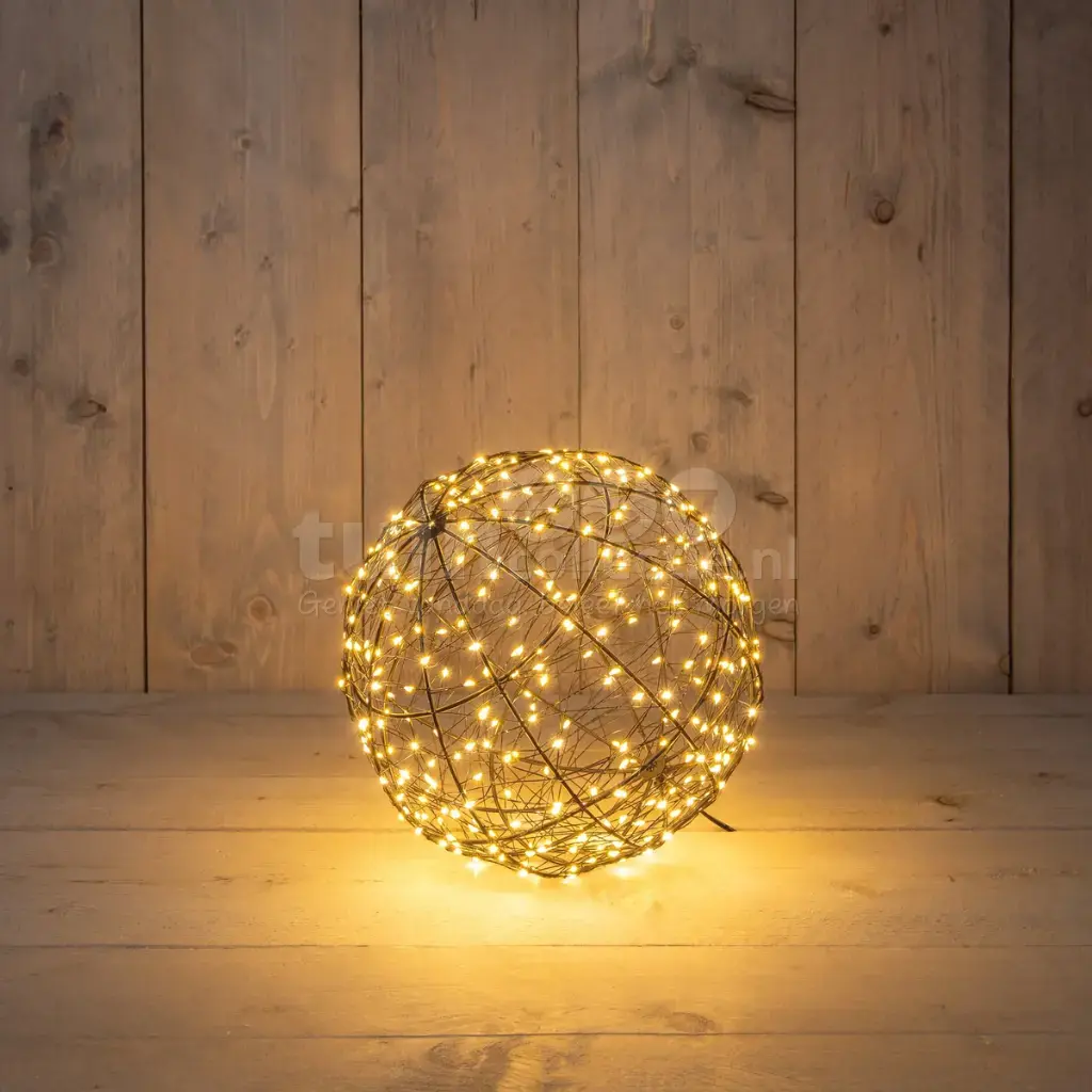 Geef jouw huis of tuin een magische kerstsfeer met deze kleine lichtbol van Anna's Collection! De verlichte bol bestaat uit een zwart metalen frame met een diameter van 25cm. Hij is omwikkeld met een zwart snoer met 300 LED lampjes die klassiek warm licht geven. De verlichting werkt op een IP44 transformator (netstroom), geschikt voor binnen en buiten en heeft een aanloopsnoer van 5 meter. Daarnaast werkt de lichtbol met een aan/uit knop of de handige timerfunctie. Wanneer de timerfunctie ingeschakeld wordt, brandt de verlichting 8 uur lang en gaat daarna voor 16 uur uit. De verlichting gaat de volgende dag automatisch weer aan op het tijdstip waarop ze de eerste keer zijn ingeschakeld. Bevestig de bol met lampjes bijvoorbeeld aan de vlaggenstok, pergola, boom of in huis en geniet van een prachtige sfeerverlichting tijdens de feestdagen!