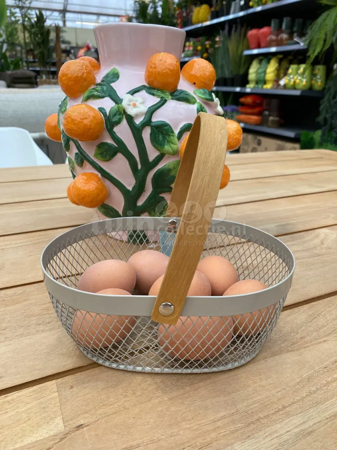 Dit oogstmandje is erg leuk ter decoratie in huis of tijdens Pasen op tafel. Uiteraard is hij ook zeer geschikt voor het paaseitjes rapen in de tuin. Het ijzeren mandje is 20x15cm groot met een hoogte van 7,5cm. Daarbij is het draadmandje voorzien van een bruin hengsel, waardoor hij eenvoudig op te pakken is. Hij is verkrijgbaar in de drie kleuren; zwart, taupe en wit*.