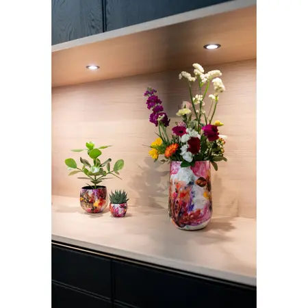 Laat jouw kamerplant stralen in de Sweet Magnolia bloempot van Ter Steege! Deze Sweet Magnolia bloempot is afkomstig uit de collectie van kunstenares Lammie en kenmerkt zich door zijn opvallende bloempatroon in roze, wit, paars en geel en met een touch of gold. De bloempot bestaat uit één stuk metaal en een high-gloss epoxylaag, waardoor hij waterdicht is. Echter heeft metaal de eigenschap om te oxideren als het in contact komt met water. Maak daarom gebruik van een inzethoes of waterdichte plastic zak om roesten te voorkomen. Verder is hij 16cm hoog met een diameter van 21cm op het breedste punt. Daarnaast is de onderzijde voorzien van nopjes, waardoor de ondergrond niet zal beschadigen.