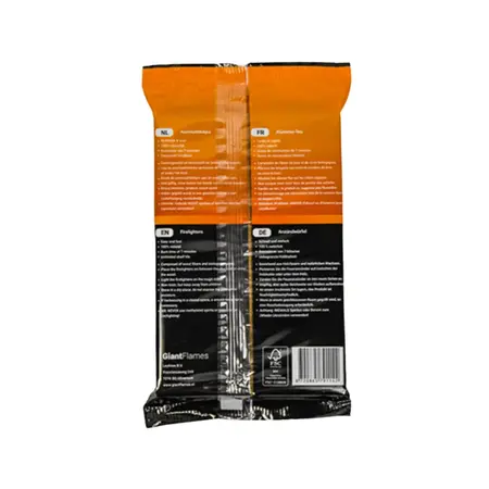 Met de Giant Flames aanmaakblokjes steek je eenvoudig en snel het vuur aan van je barbecue, haard of vuurschaal. Deze 100% natuurlijke blokjes zorgen voor een schone verbranding zonder ongewenste geuren of rook. Ze zijn gemaakt van houtvezels en biologische was, waardoor ze makkelijk vlam vatten en een lange brandduur van ongeveer 7 minuten hebben. Bovendien zijn de blokjes FSC-gecertificeerd, wat betekent dat ze afkomstig zijn uit duurzaam beheerde bossen. Leg één of meerdere blokjes onder je houtskool, briketten of haardhout en steek ze aan. Binnen de kortste keren heb je een stabiel en sfeervol vuur. In de verpakking zitten 32 aanmaakblokjes, genoeg voor meerdere keren gebruik. Kies voor Giant Flames aanmaakblokjes en steek je vuur op een gemakkelijke, betrouwbare en milieuvriendelijke manier aan!