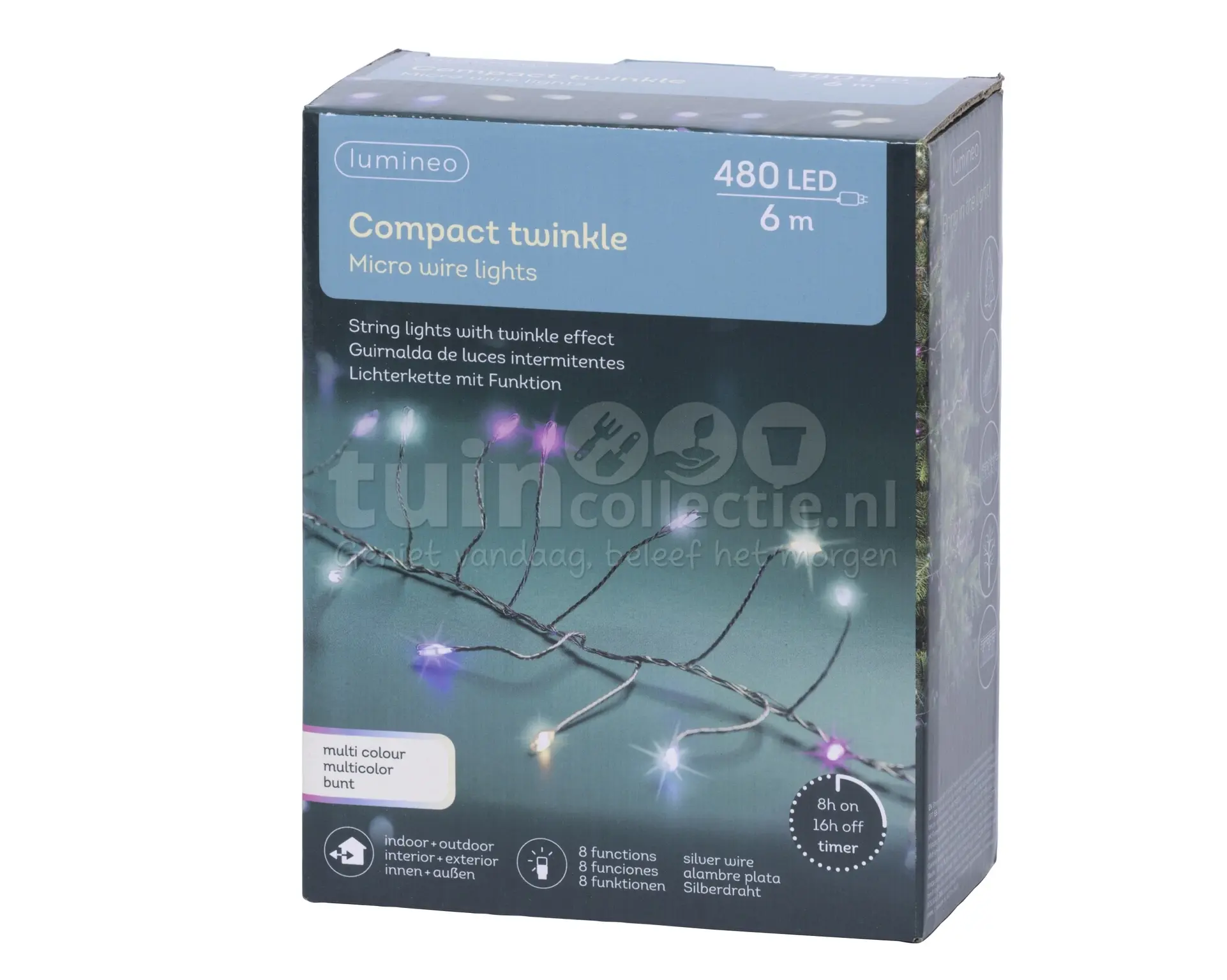Deze Compact draadverlichting van Lumineo geeft een bijzondere sfeer aan jouw kerstboompje of kerstdecoratie. De kerstverlichting bestaat uit een zilverdraad van 6 meter lang met daaraan 480 micro LED lampjes in de kleuren roze, paars, koel wit en warm wit. De totale lengte van het snoer is 11 meter, inclusief 5 meter aanloopsnoer en adapter. Dankzij de IP44 adapter zijn deze lampjes zowel binnen- als buitenshuis te gebruiken. Daarnaast is deze kerstverlichting voorzien van een timerfunctie en 8 twinkelende lichtfuncties. Middels een knopje op de adapter is eenvoudig te switchen tussen de verschillende functies. Met de timerfunctie brandt de verlichting 8 uur lang en gaat daarna automatisch voor 16 uur uit. De lampjes gaan de volgende dag automatisch weer aan op het tijdstip waarop ze de eerste keer zijn ingeschakeld. De meest kleurrijke verlichtingsset voor kerstmis!