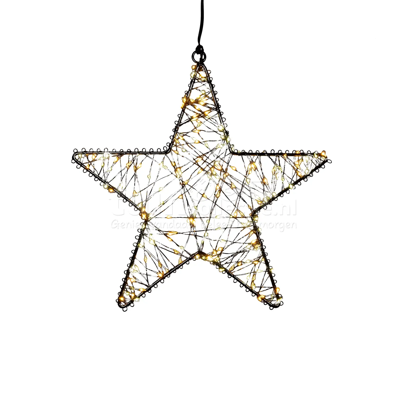 Met deze kerstverlichting in de vorm van een ster breng je in een handomdraai sfeer in huis of tuin tijdens de feestdagen. De ster bestaat uit een zwart metalen frame dat omwikkeld is met een zwarte snoer met 300 micro LED-lampjes in warm wit en classic warm licht. Daarnaast is de ster voorzien van een dimfunctie, waarmee hij op vijf verschillende lichtstanden in te stellen is: Off, 25%, 50%, 75% en 100%. Op de hoogste stand (100%) heeft de ster een flash-effect waardoor de lampjes gaan twinkelen, bij de andere standen branden de lampjes constant. De kerstverlichting heeft een handige timerfunctie; wanneer deze is ingeschakeld, brandt de verlichting 8 uur en gaat daarna 16 uur uit. De verlichting gaat de volgende dag automatisch weer aan op het tijdstip waarop hij de eerste keer is ingeschakeld. Verder is de ster voorzien van een 5 meter lang aanloopsnoer en een IP44-transformator, waardoor hij geschikt is voor binnen en buiten. Deze ster kerstverlichting heeft een diameter van 36cm en een hoogte van 5cm. Hang de ster aan de muur of schutting en geniet van een sfeervolle kerstverlichting!