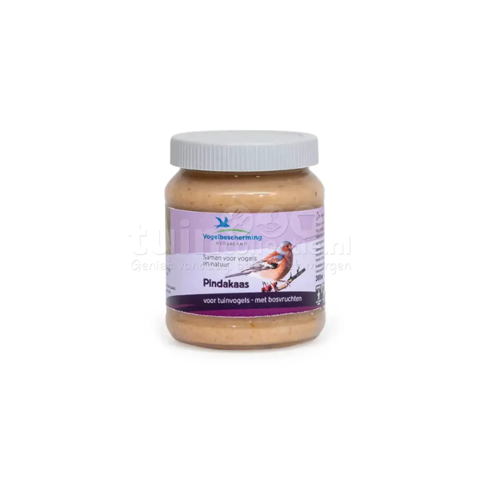 Tijdens de koudere herfst- en winterperiode hebben de tuinvogels extra energie nodig om warm te blijven. De vogel pindakaas van Vogelbescherming Nederland is speciaal ontwikkeld om aan deze behoefte te voldoen. Door deze pindakaas aan te bieden in een pindakaaspothouder help je de tuinvogels de koude maanden door te komen en vergroot je hun overlevingskansen. Deze pindakaas is rijk aan essentiële vetten en oliën, die een belangrijke energiebron vormen voor vogels in het najaar. De basis van alle smaakvarianten vogelpindakaas is gemaakt van pindameel uit olierijke, ongebrande pinda's, rundertalg en maïsmeel. Rundertalg en pindameel zijn beide vetrijk en zorgen voor voedzame calorieën. Maïsmeel zorgt onder andere voor het juiste smeltpunt. Dit voorkomt dat de pindakaas bij hogere temperaturen vloeibaar wordt en er geen risico is op verkleving van poten of veren. Daarbij bevat deze vogelpindakaas bosvruchten. Daarnaast zijn de pinda's die gebruikt worden voor de vogelpindakaas getest op de afwezigheid van aflatoxine, een giftige stof die soms in pinda's voorkomt. De pindakaas bevat bovendien geen toegevoegd zout. Een veilige en verantwoorde traktatie voor de vogels in je tuin!