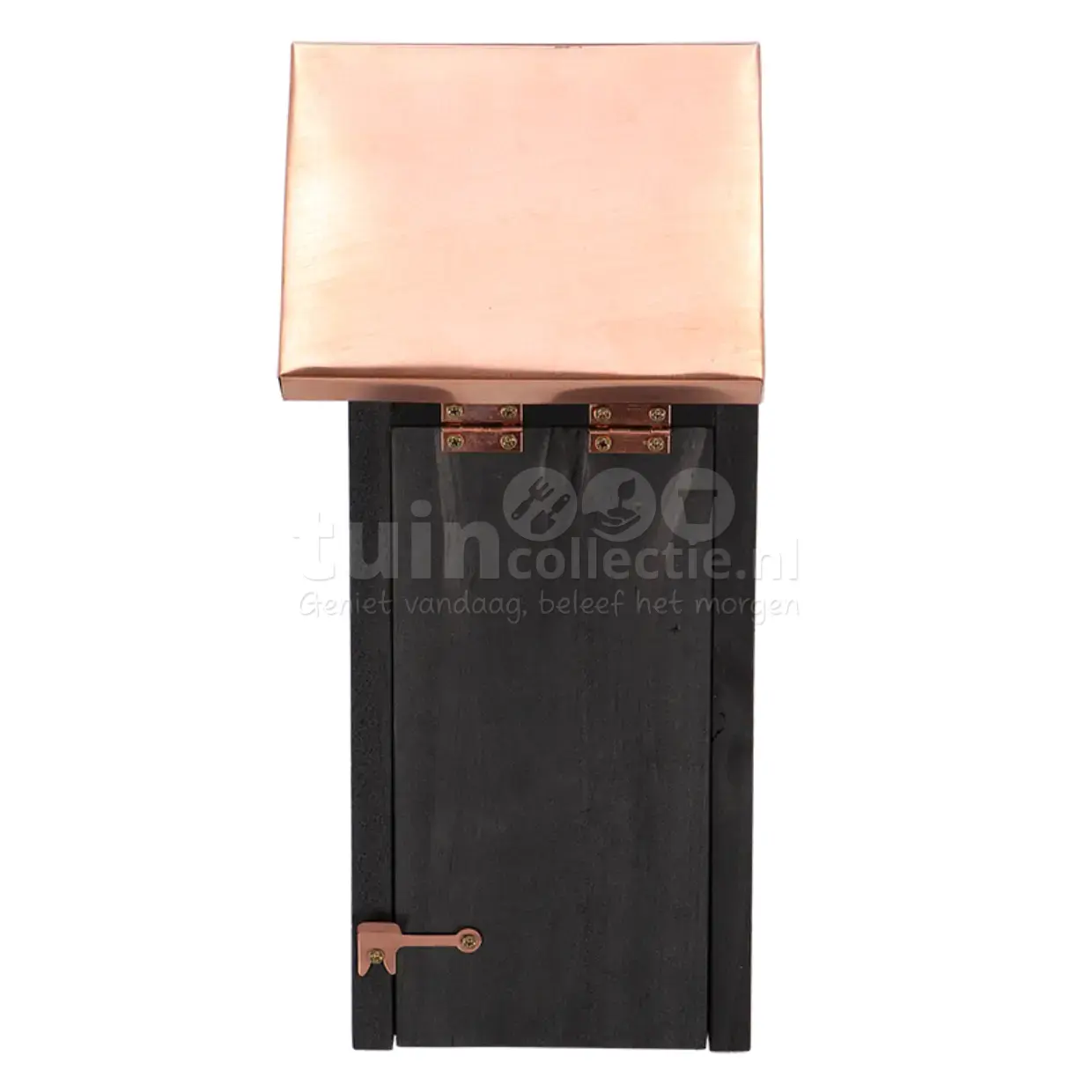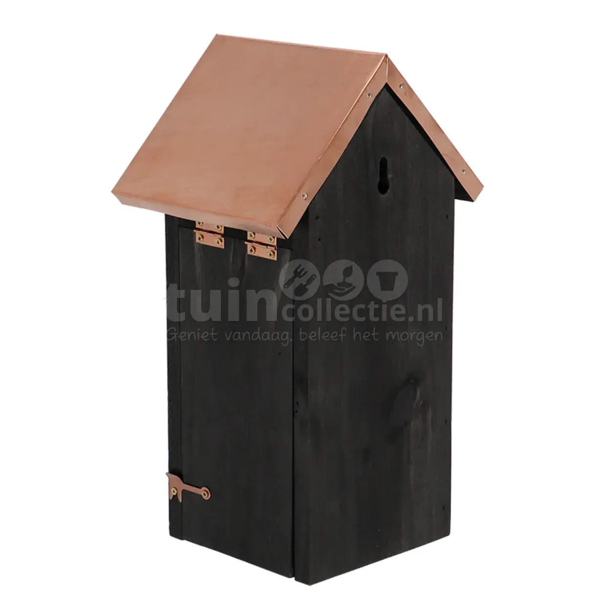 Met deze moderne en stijlvolle nestkast trek je met name de koolmees aan in je tuin. Naast de koolmees kunnen ook andere vogels gebruikmaken van deze kast, zoals de pimpelmees, boommus, huismus, boomklever en bonte vliegenvanger. Het huisje zorgt voor een fijne schuilplek voor de vogels. De nestkast is gemaakt van 100% FSC vurenhout dat zwart van kleur is. Verder is hij voorzien van een koperen dakje. De nestkast heeft een hoogte van 29,7cm, een lengte van 17cm en een breedte van 14cm.