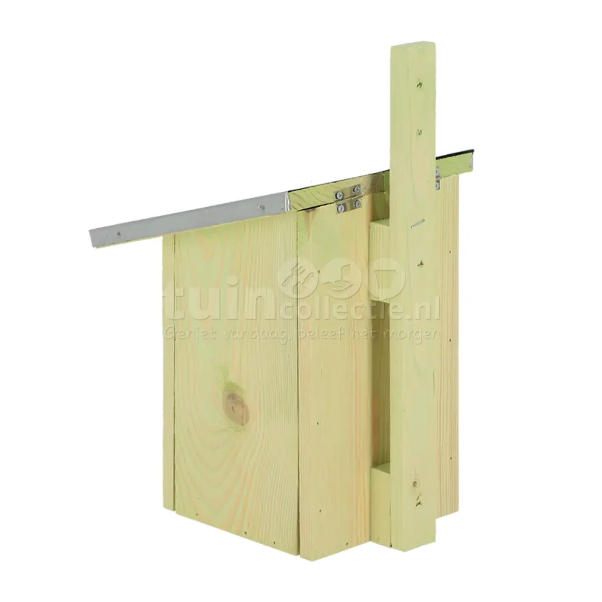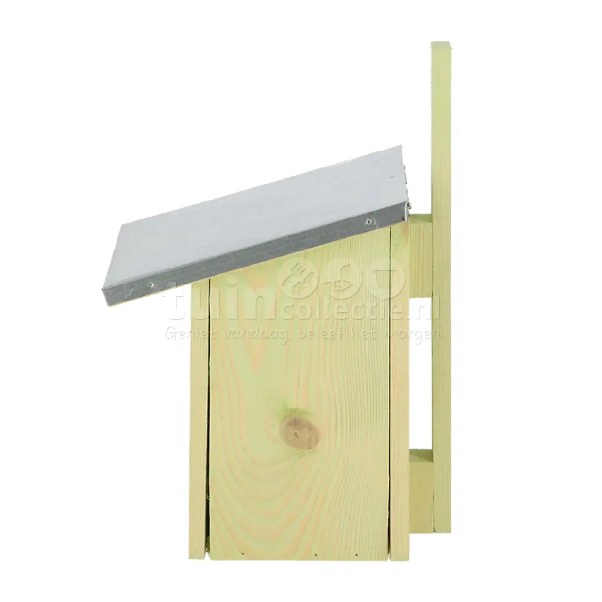 De nestkast is gemaakt van vurenhout en heeft een zinken dakje. Aan de voorzijde zit een kleine opening van 32mm, geschikt voor onder andere de koolmees. Aan de achterzijde bevindt zich een bevestigingslat, waarmee de nestkast eenvoudig met twee schroeven aan de muur of schutting kan worden bevestigd (schroeven niet inbegrepen).