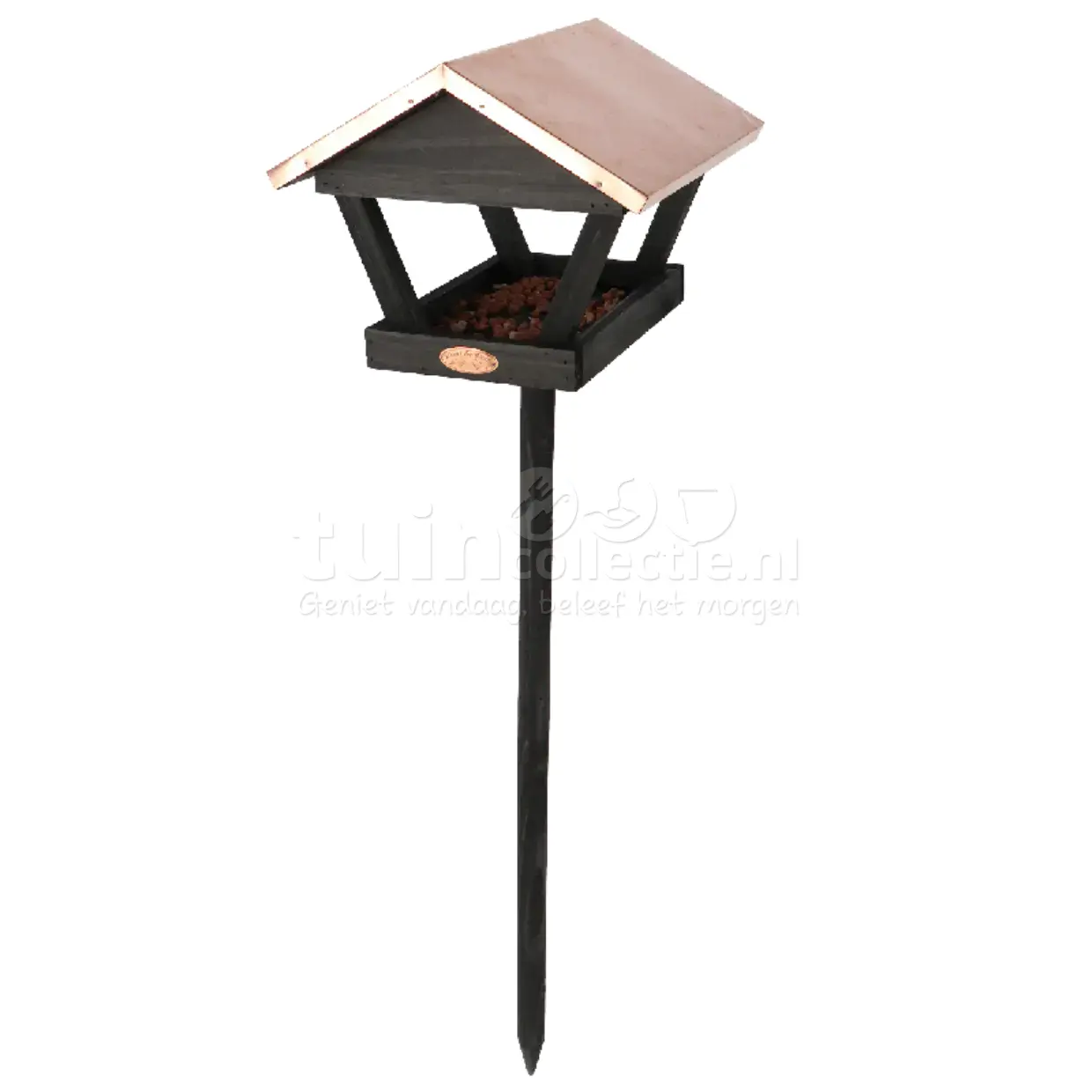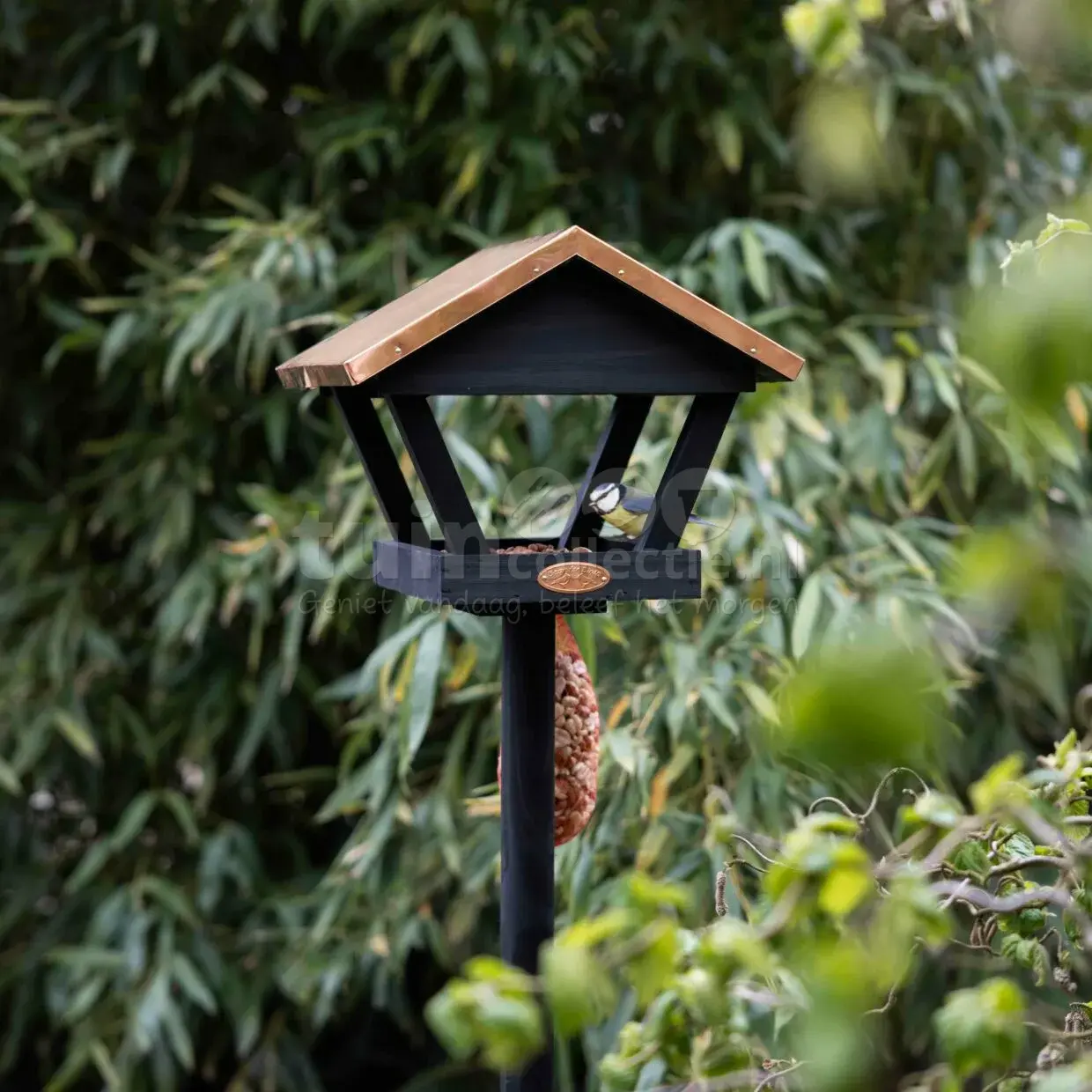 Met deze moderne voedertafel help je de vogels in de tuin een handje tijdens de wintermaanden. De voedertafel op paal kan eenvoudig op elke gewenste plek in de tuin worden geplaatst. Door de open structuur van het voederhuisje kunnen de vogels van alle kanten genieten van het voer. Aan de onderzijde bevindt zich bovendien een handige haak waaraan je nog extra vogelvoer of een netjes met pinda’s kunt ophangen. De voedertafel is gemaakt van 100% FSC-gecertificeerd grenenhout en heeft een stijlvolle zwarte kleur. Het koperen dakje zorgt ervoor dat het voer droog blijft. Geef deze voedertafel op paal een mooie plek in je tuin en geniet van alle vogels die komen smullen van het lekkers!