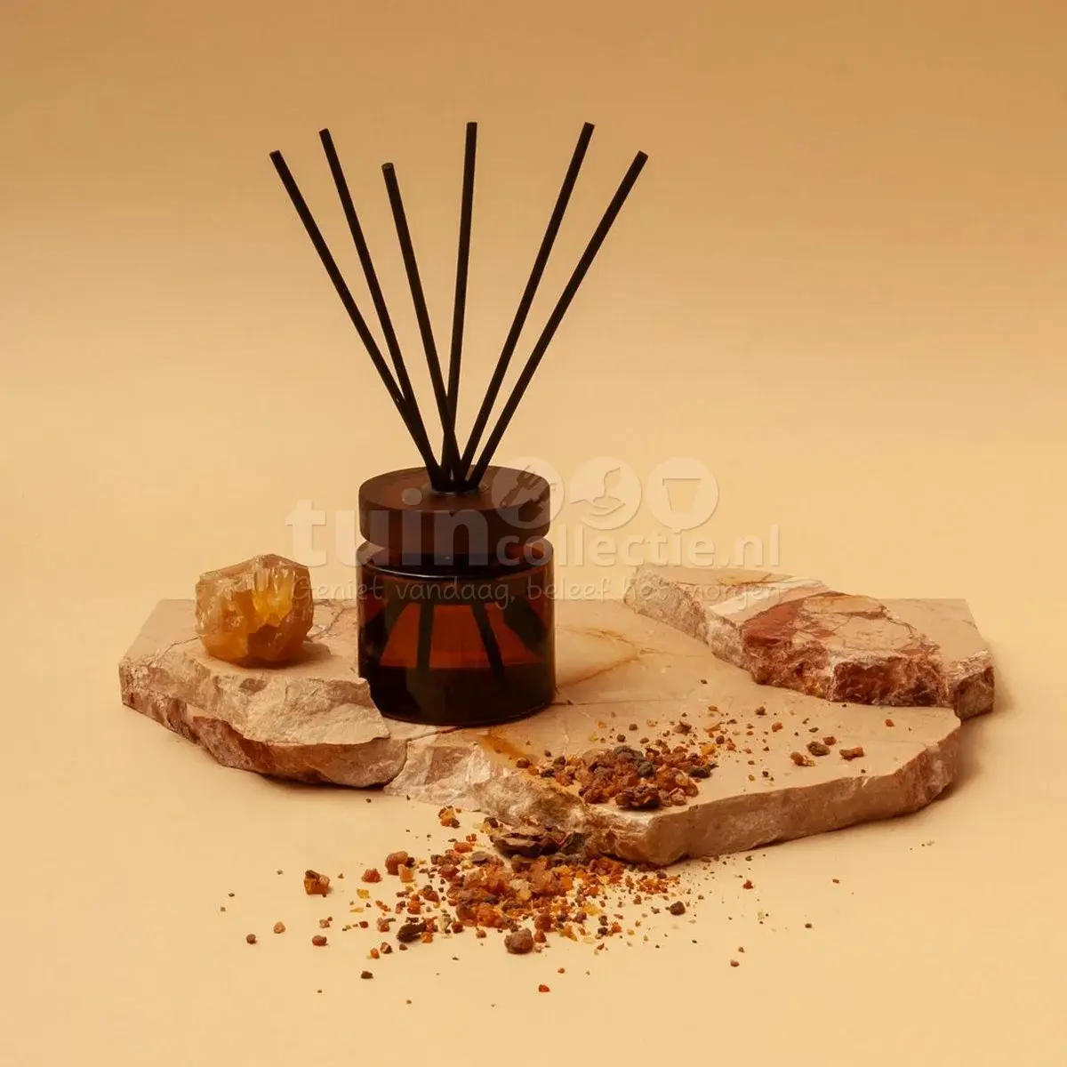 Met deze geurstokjes uit de Iconic Collection van Spaas verspreid je de lekkerste geuren in huis. De geurstokjeshouder is gemaakt van warm donkerbruin glas en heeft aan de bovenzijde een houten ring, wat hem een luxe uitstraling geeft. De reed diffuser is 24cm hoog en heeft een diameter van 7,5cm. Deze set wordt geleverd met 150ml geurolie en zwarte geurstokjes. Plaats de stokjes in het glas en geniet van een heerlijke, langdurige geurverspreiding door je huis. Deze geurstokjes hebben de geur Glorious Glimmer; een heerlijk ruikende mix van mirre en amber gehuld in een muskusachtige omhelzing waardoor een verleidelijke en mysterieuze geur ontstaat. Een amberachtige muskusgeur met geurnoten van bergamot, cipres, wierook, mirre, poederachtige noten, muskus, vanille, ambroxan en sandelhout. Dankzij het navulconcept kun je blijven genieten van de heerlijke geur. Daarnaast zijn deze Iconic geurstokjes een perfecte aanvulling op de Delight geurkaarsen van Spaas.
