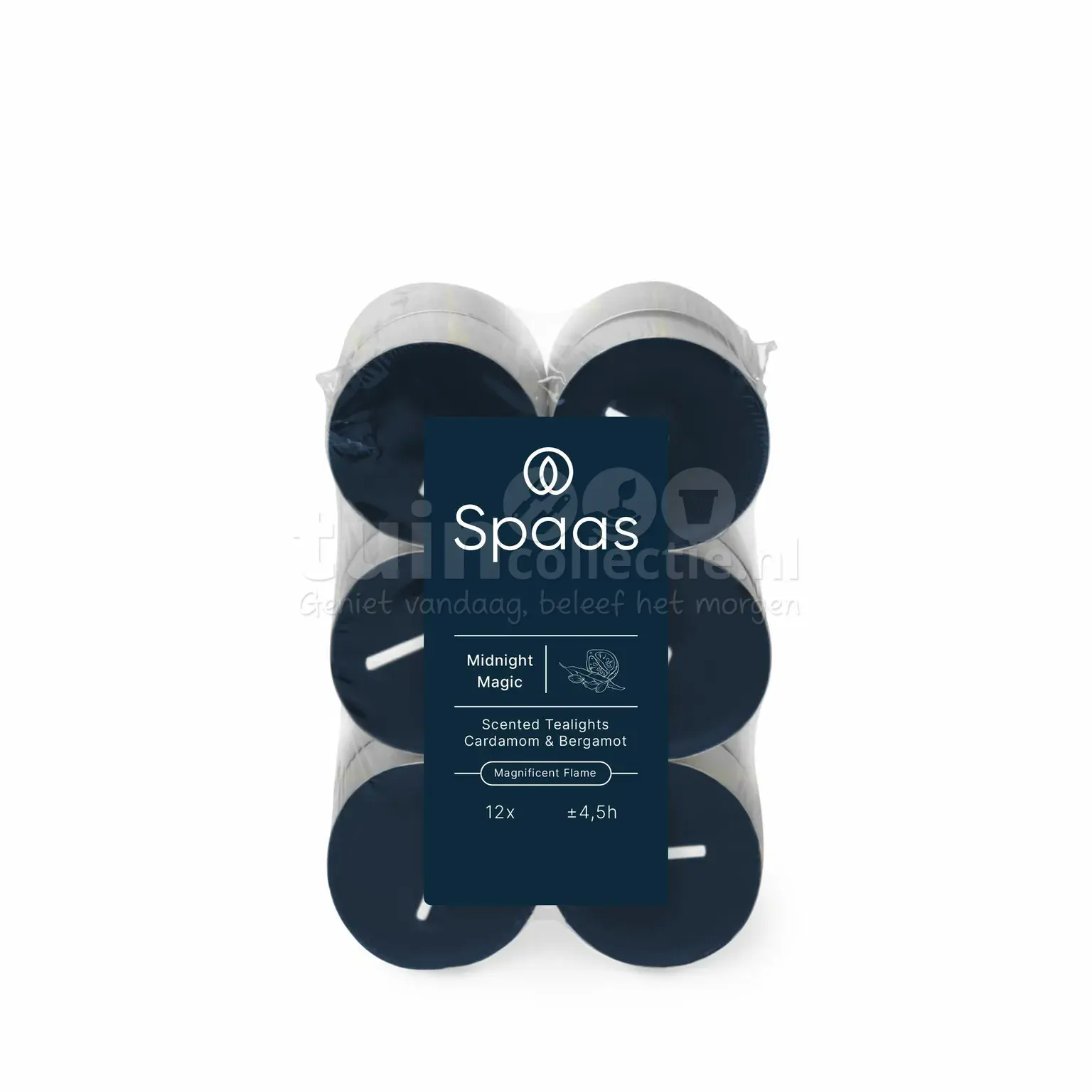 Met de Spaas Clearlights breng je een warme en gezellige sfeer in huis. Deze Midnight Magic geurtheelichtjes verspreiden een zachte geur van Kardemom en bergamot en zijn blauw van kleur. Leuk voor in een waxinelichthouder in de woonkamer, badkamer of het toilet. Verder hebben de Spaas Clearlights theelichtjes een diameter van 4cm, zijn ze gemaakt van paraffine en zitten ze in een zilver cupje. Elk theelichtje heeft een brandduur van ca. 4,5 uur. De verpakking bevat 12 geurtheelichtjes.