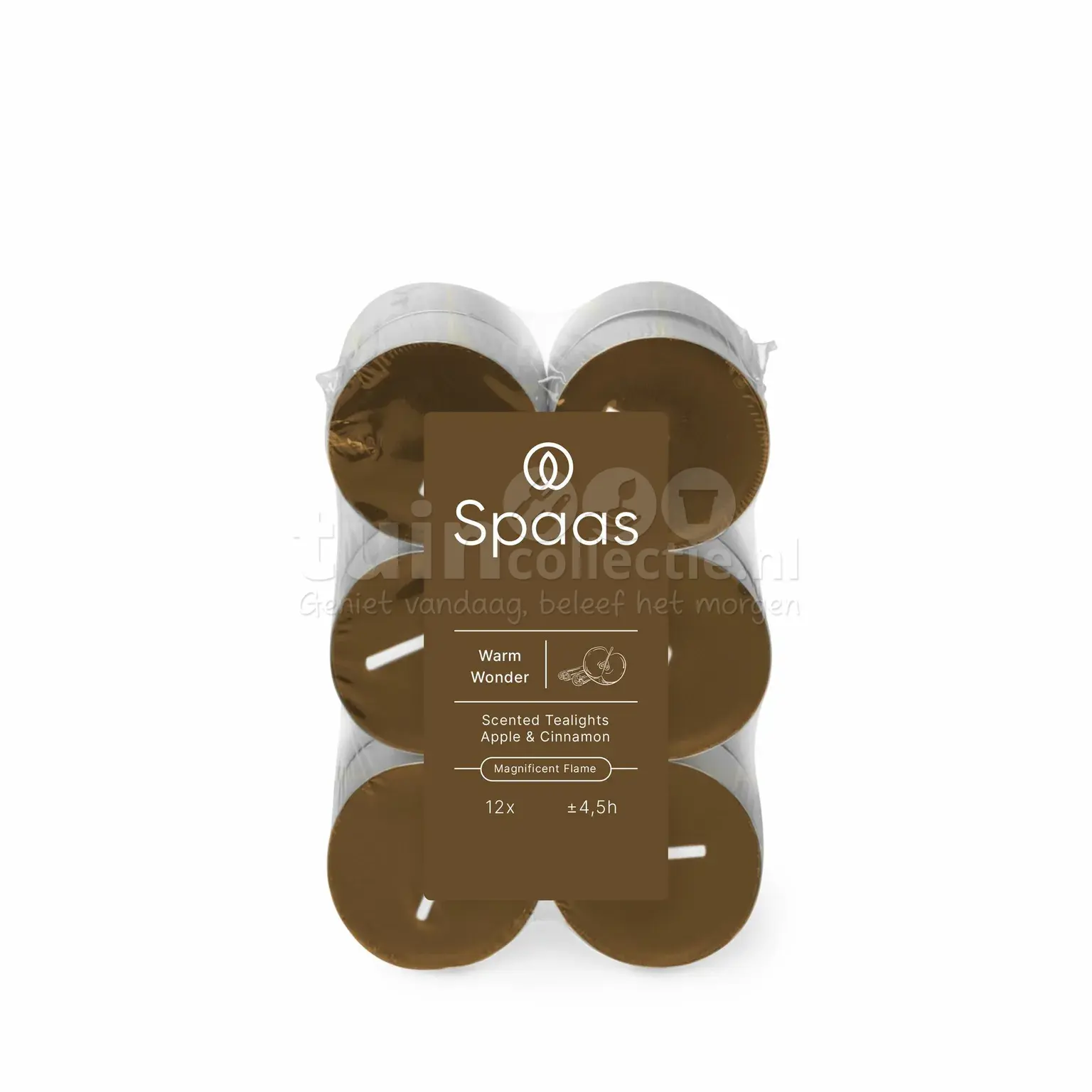 Met de Spaas geurtheelichten breng je een warme en gezellige sfeer in huis. Deze Warm Wonder geurtheelichtjes verspreiden een zachte geur van appel en kaneel en zijn bruin van kleur. Leuk voor in een waxinelichthouder in de woonkamer, badkamer of het toilet. Verder hebben de Spaas theelichtjes een diameter van 4cm, zijn ze gemaakt van paraffine en zitten ze in een zilver cupje. Elk theelichtje heeft een brandduur van ca. 4,5 uur. De verpakking bevat 12 geurtheelichtjes.