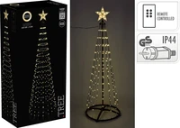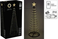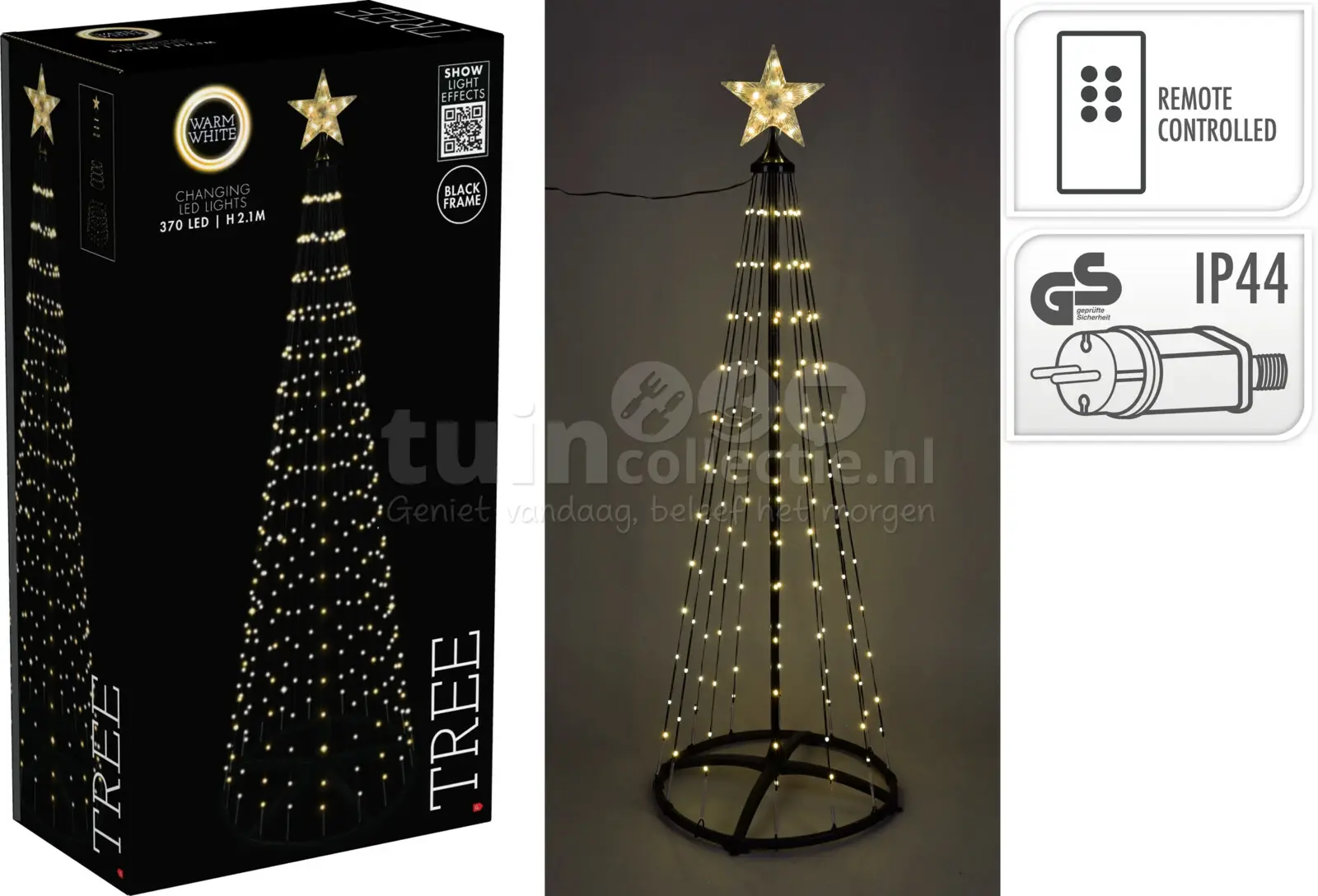 Verlicht jouw huis of tuin op spectaculaire wijze met deze LED kerstboom! De kerstboom bestaat uit een stevig zwart metalen frame van 210cmhoog en een diameter van 70cm. De voet is verstevigd met een kunststof vloerframe. De verlichtingssnoeren zijn verticaal tussen het frame bevestigd en zijn voorzien van 370 LED lampjes met warm witte verlichting. Deze lampjes zijn met diverse lichteffecten instelbaar middels de bijgeleverde afstandsbediening. De verlichting werkt op een IP44 transformator, waardoor de LED Kerstboom zowel binnen- als buitenshuis geplaatst kan worden. Verder is de verlichting ook in te stellen met een handige 6 of 8 uurs timerfunctie en dimfunctie. Wanneer de timerfunctie ingeschakeld wordt, brandt de verlichting 6 uur lang of 8 uur lang en gaat daarna automatisch voor 18 of 16 uur uit. De lampjes gaan de volgende dag automatisch weer aan op het tijdstip waarop ze de eerste keer zijn ingeschakeld.