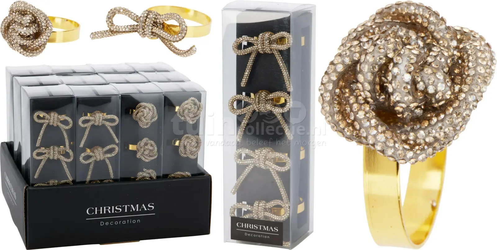 Geef een chic tintje aan je tafeldecoratie tijdens de feestdagen met deze servetringen! De servetringen zijn gemaakt van metaal en zijn goud van kleur. Daarbij zijn ze verkrijgbaar in twee verschillende soorten: met strik of knoop*. De versieringen bovenop de ring zijn gemaakt van plastic en versierd met strass steentjes, wat ze een luxe en feestelijke uitstraling geeft. Verder worden deze servetringen geleverd in een set van 4 stuks. Combineer de servetringen met servetten naar keuze en geniet van een sierlijk versierde kersttafel.