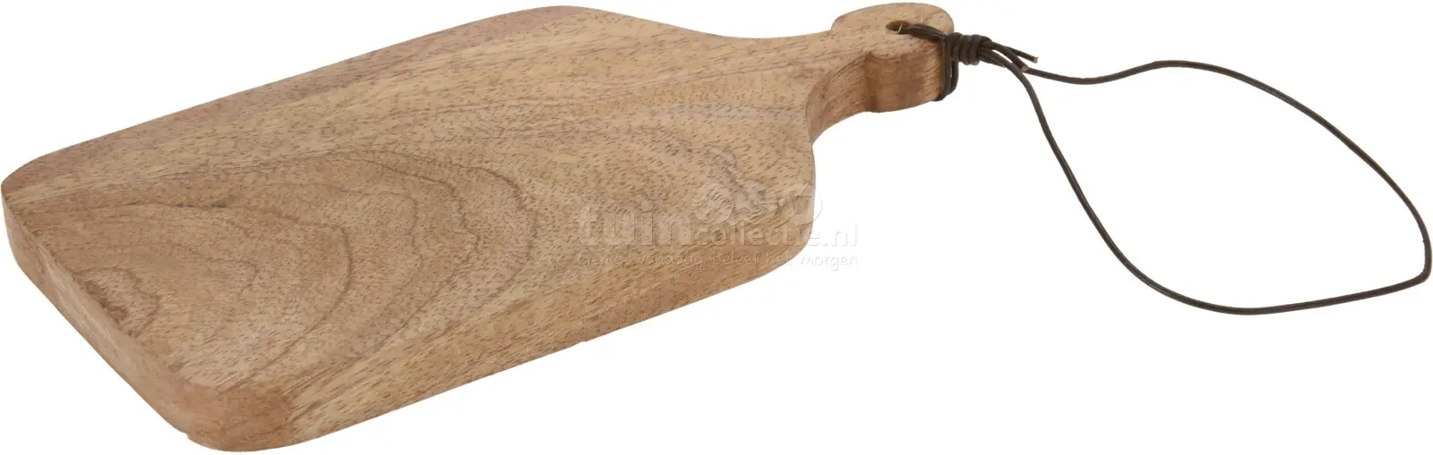 Deze houten plank is perfect als snijplank of serveerplank voor de lekkerste hapjes. Daarnaast is hij ook leuk ter decoratie en mooi te combineren met andere keukenaccessoires. De plank is gemaakt van mangohout en heeft een warme, natuurlijke bruine kleur. Deze kleine serveerplank heeft een lengte van 19,5cm en een breedte van 10cm. Aan de bovenzijde is een koord van imitatieleer bevestigd. Dit zorgt niet alleen voor een sfeervolle uitstraling, maar maakt het ook mogelijk om de plank eenvoudig op te hangen.