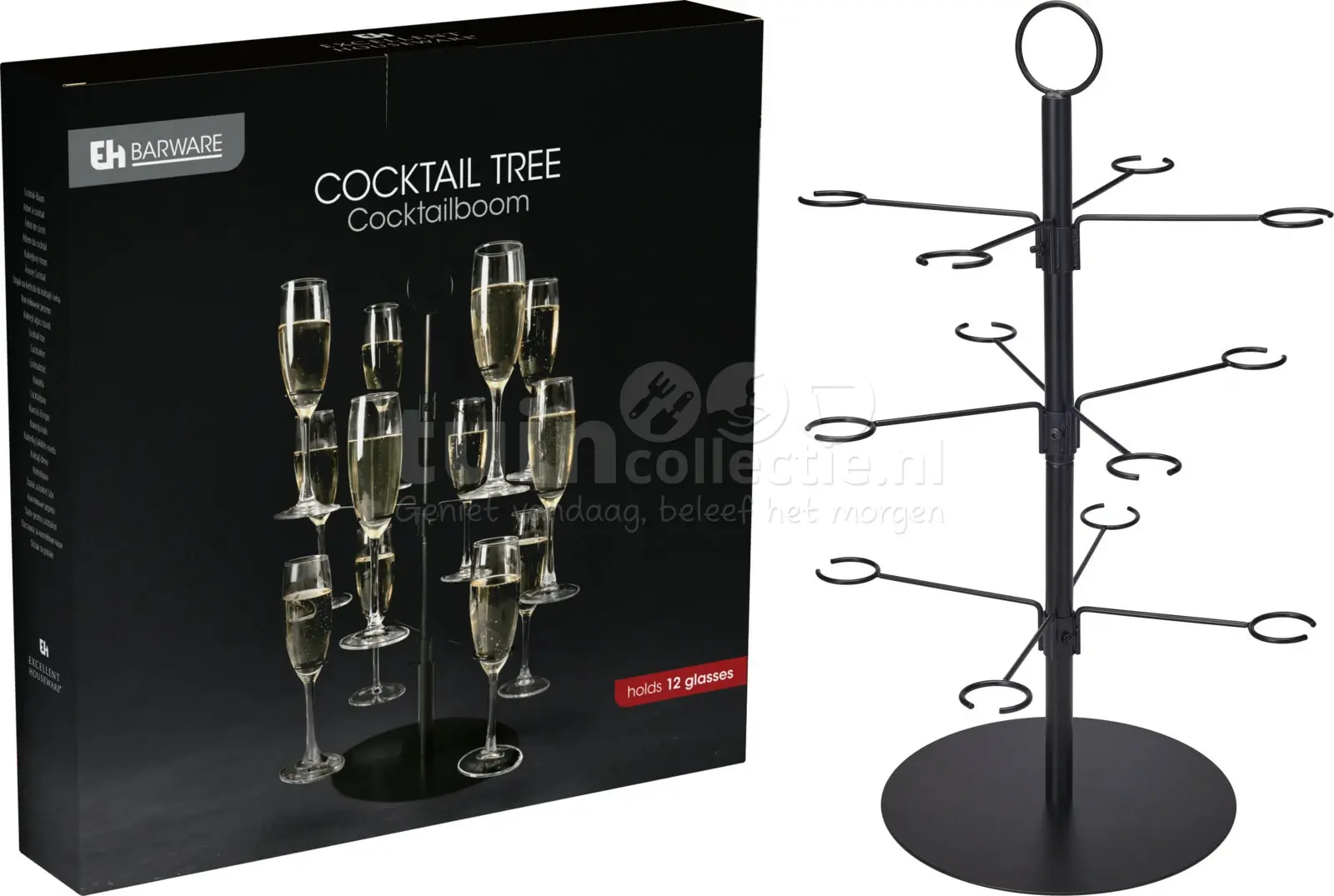 Presenteer je cocktails, champagne- of wijnglazen op een stijlvolle en feestelijke manier met deze cocktailboom! Perfect voor speciale gelegenheden, een feestje of het kerstdiner. De cocktailboom is gemaakt van gepoedercoat staal en is mat zwart van kleur, wat hem een stoere, moderne uitstraling geeft. Deze elegante standaard is opgebouwd uit drie lagen en biedt plaats voor maximaal 12 glazen. Daarbij is hij eenvoudig te monteren. De cocktailboom heeft een hoogte van 55,5cm en een diameter van 34cm. Een echte eyecatcher op elke feesttafel!