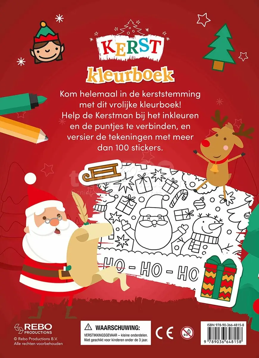 Kom helemaal in de kerststemming met dit vrolijke kleurboek! Het paperback boek bevat 48 pagina's vol met leuke kleurplaten en tekeningen van punt tot punt. Daarnaast zitten er meerdere stickervellen in het boek met meer dan 100 stickers. Help jij de kerstman met het inkleuren van de leuke tekeningen en de puntjes te verbinden in dit kleurboek?