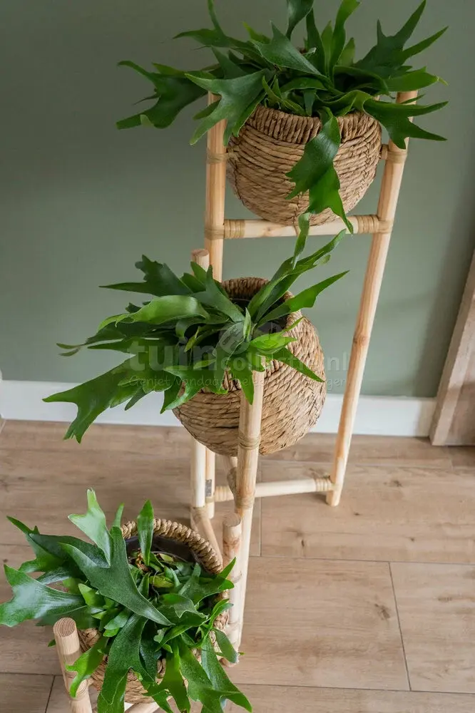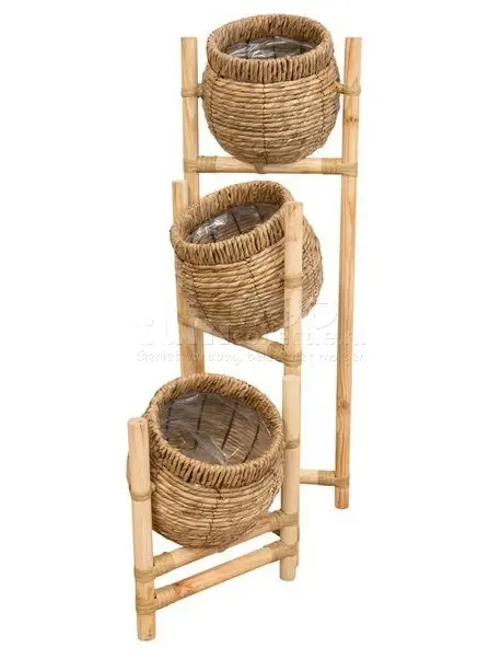 Creëer een urban jungle in je huis met deze sfeervolle plantenstandaard Jette! Deze set bestaat uit een plantenrek gemaakt van hout en drie plantenmanden die handgeweven zijn van zeegras. Daarbij zijn de manden verstevigd met een metalen frame en zijn ze voorzien van een 100% waterdichte voering. Verder zijn de plantenmanden met wicker, een stevig soort kunststof, aan de houten palen bevestigd van de plantenstandaard. Zowel het houten rek als de plantenmanden hebben een naturel bruine kleur. De bloempotten zijn 30cm hoog en hebben een diameter van 34cm. De plantenstandaard is in totaal 100cm hoog. Plaats je favoriete planten in de potten en geniet van de natuurlijke en groene, sfeer in huis!