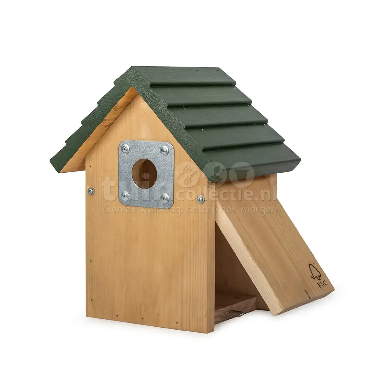 Het aantal natuurlijke broedplaatsen voor vogels neemt af. Door deze nestkast op te hangen in de tuin help je de tuinvogels aan een geschikte nest- en schuilplaats. Nestkast Vail is gemaakt van FSC-gecertificeerd dennenhout en heeft een natuurlijke bruine houtkleur met een groen gekarteld dak. Verder heeft hij een invliegopening van 32mm en is hij voorzien van een beschermplaatje bij de opening om te voorkomen dat roofvogels het nest verstoren. De kast is eenvoudig schoon te maken dankzij het zijpaneel dat open kan, zodat hij in het najaar weer klaar is voor een nieuwe bewoner. Nestkast Vail is 27cm hoog, 23cm lang en 18cm breed. Deze nestkast is bijzonder geschikt voor grote mezen zoals de koolmees en kuifmees. Daarnaast is hij ook geschikt voor vogelsoorten zoals de boomklever, bonte vliegenvanger, huismus, ringmus en gekraagde roodstaart.