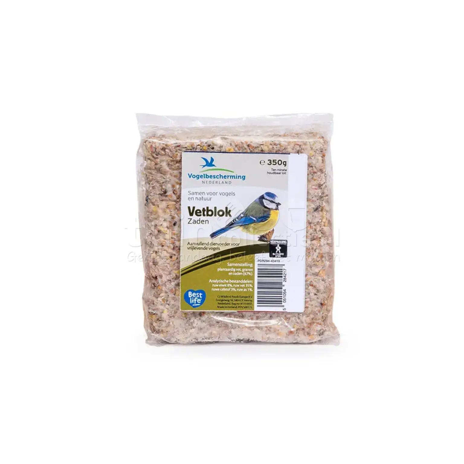 Vetblokken bevatten veel calorieën en worden graag gegeten door alle tuinvogels. Dit vetblok van Vogelbescherming Nederland zit boordevol essentiële oliën en vetten en biedt de vogels de natuurlijke, calorierijke voeding die zij het hele jaar nodig hebben, vooral in de koudere maanden. Het vetblok bevat energierijke zaden en is ideaal om in een vetblokhouder te plaatsen of op een lage voedertafel te leggen, zodat ook vogels die dicht bij de grond eten, zoals de roodborst en de merel, ervan kunnen genieten. Het vetblok heeft een lengte van 11,5cm, een breedte van 10cm en een dikte van 3cm.