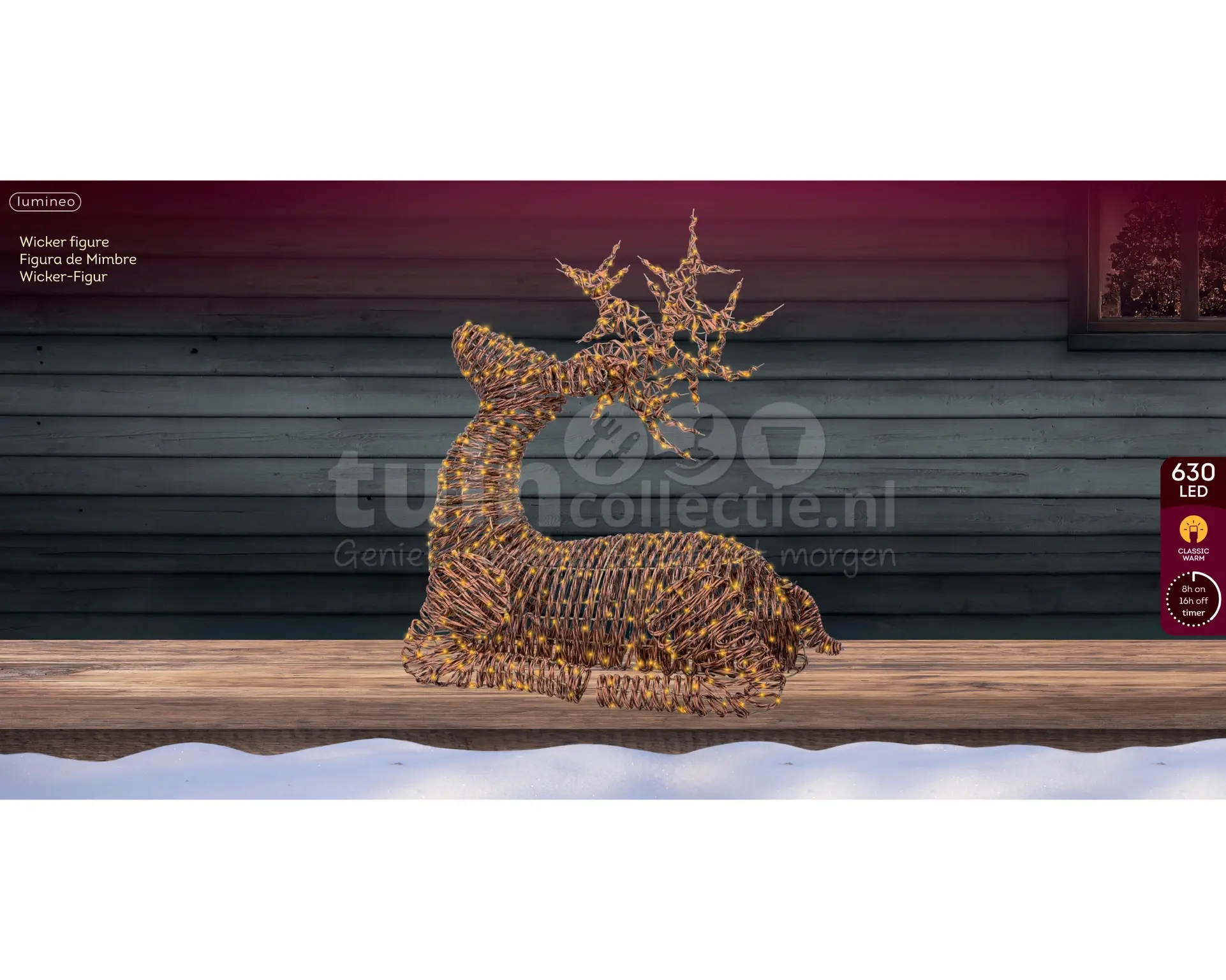 Versier jouw huis of tuin met dit liggende rendier van Lumineo. Dit grote verlichte kerstfiguur is gemaakt van wicker in de vorm van een liggend rendier. Hij is 76cm lang, 33cm breed en 88cm hoog. Het rendier is bruin van kleur en is voorzien van 630 LED lampjes met klassiek warm licht. De verlichting werkt op een IP44 adapter, die geschikt is voor binnen- en buitenshuis en heeft een aanloopsnoer van 500cm. Ook werkt de kerstverlichting met een handige timerfunctie. Wanneer de timerfunctie ingeschakeld staat, brandt de verlichting 8 uur lang en gaat daarna voor 16 uur uit. De verlichting gaat de volgende dag automatisch weer aan op het tijdstip waarop ze de eerste keer is ingeschakeld. Plaats het liggende rendier in de tuin of in huis en geniet de hele kerstperiode van sfeervolle verlichting!