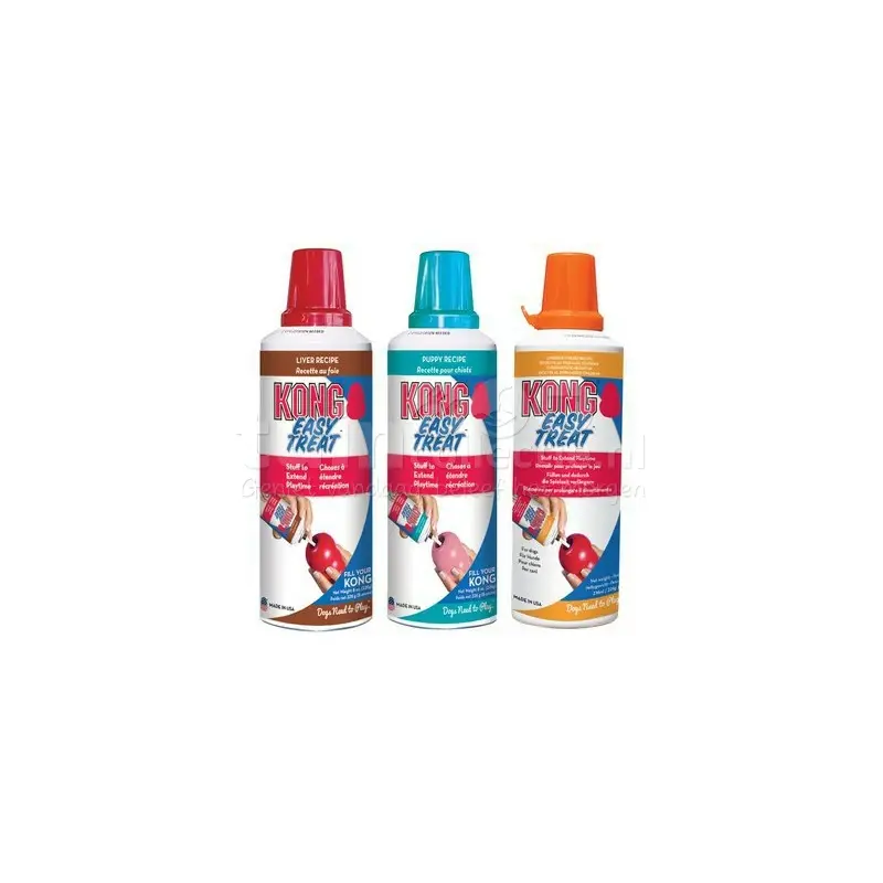 Deze Easy Treat kun je gemakkelijk doseren. Daardoor kun je hem goed aanbrengen in kleine hoeveelheden in alle rubberen Kong speeltjes. De Easy Treats zijn gemakkelijk te verteren en bevatten geen transvetten. De Easy Treat Puppy is speciaal samengesteld voor de gevoelige maag van een puppy. De spuitbus is milieuvriendelijk en heeft een ingebouwde spuitmond.