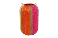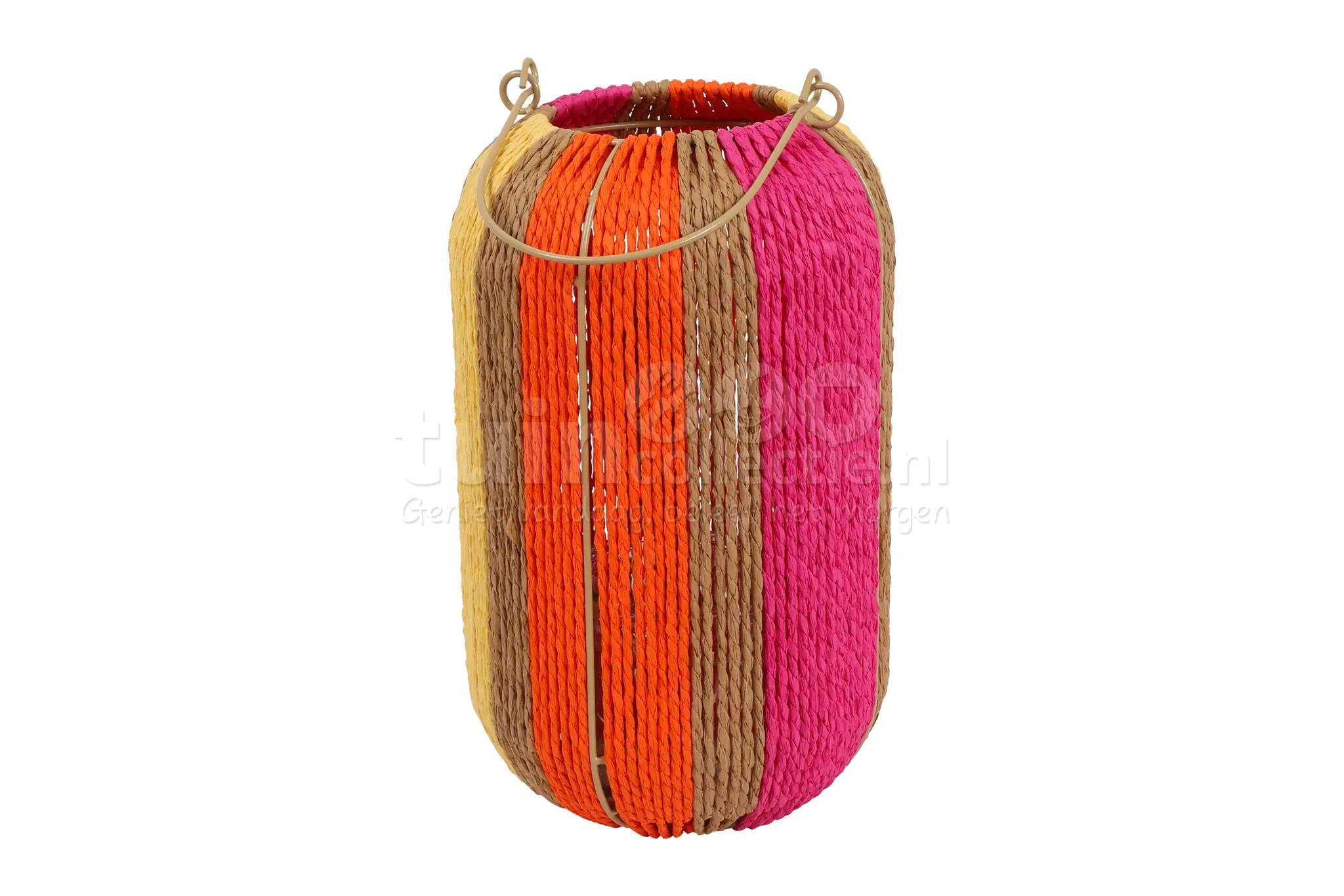 De Countryfield Lantaarn Milan geeft in een handomdraai kleur aan jouw interieur of terras! Deze lantaarn bestaat uit een metalen frame dat bespannen is met touw in vier kleuren; bruin, roze, geel en oranje. Deze kleurencombinatie zorgt voor een zomers gevoel. In de lantaarn staat een kaarsglas, waar eenvoudig een waxinelichtje of kleine stompkaars in te plaatsen is en je de hele avond geniet van sfeervol kaarslicht. Met het metalen hengsel kun je de lantaarn gemakkelijk verplaatsen of zelfs ophangen. Lantaarn Milan is 34cm hoog met een diameter van 20cm.