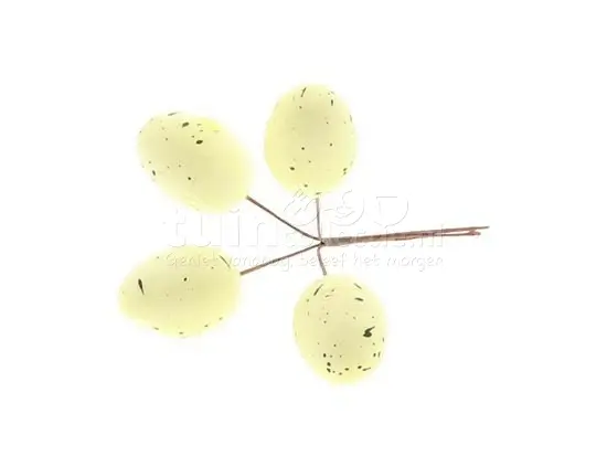 Deze paasdecoratie bestaat uit een bundeltje van 4 paaseitjes op een stokje, met een lengte van 13cm. De paaseitjes zijn gemaakt van piepschuim en zijn pastel geel van kleur met bruine spikkels. Leuk om te gebruiken in een vaasje of te verwerken in een paasstukje op tafel.
